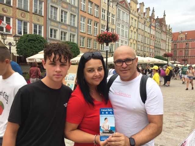 来自格但斯克的一家三口,Robert先生Agnieszka 太太及儿子Oskar Urbańscy 都在征签簿上签名,表达一个共同的心愿:“希望尽快停止迫害法轮功,世界需要真善忍。”