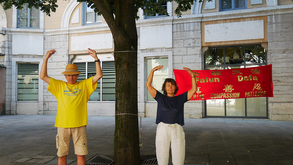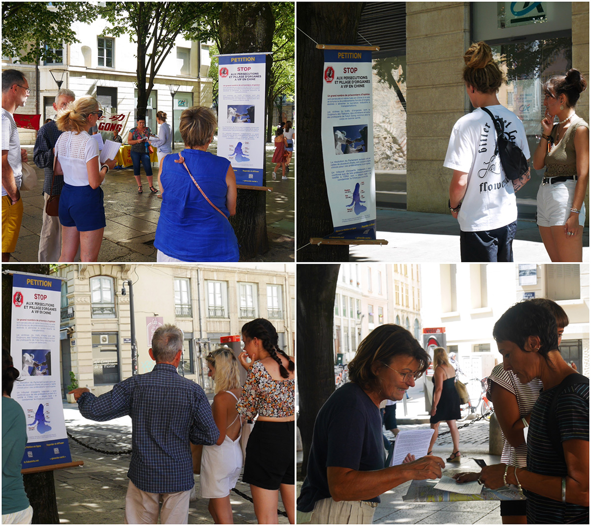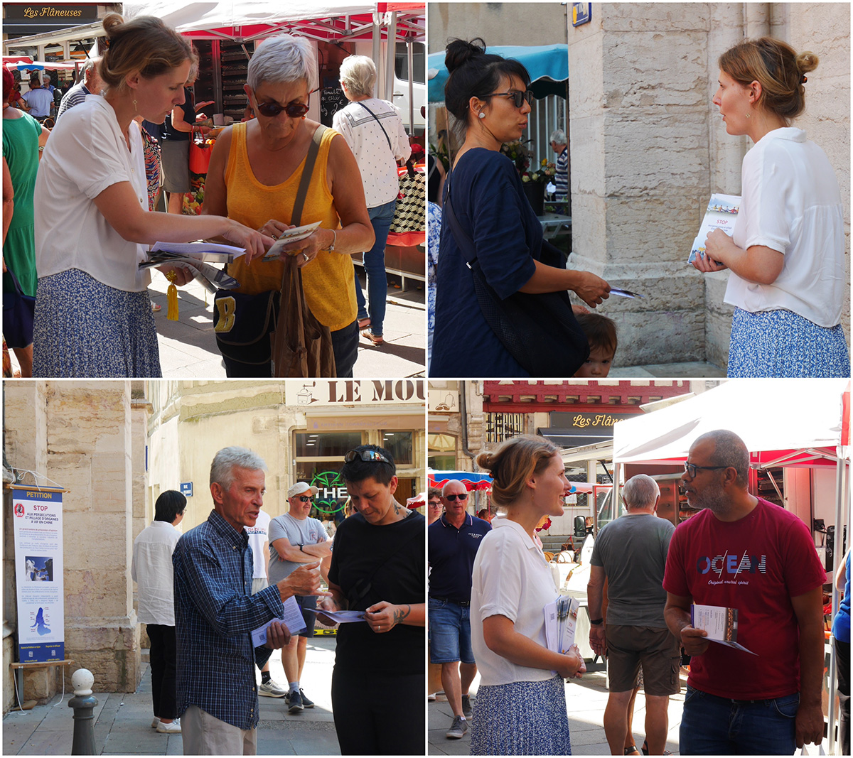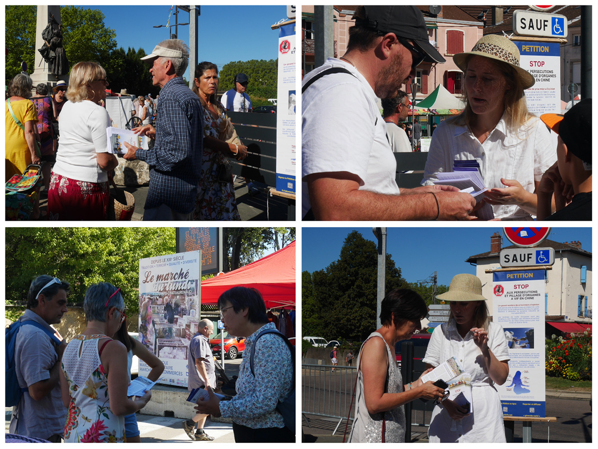 二零二二年七月三十日至八月二日,在法国东部贝桑松(Besançon)市政厅前、索恩河畔-沙隆(Chalon-sur-Saône)集市、鲁昂(Louhans)集市和里昂(Lyon)市中心,都留下了法轮功学员的身影。人们感谢法轮功学员传播真相,呼唤良知,并鼓励他们坚持下去。