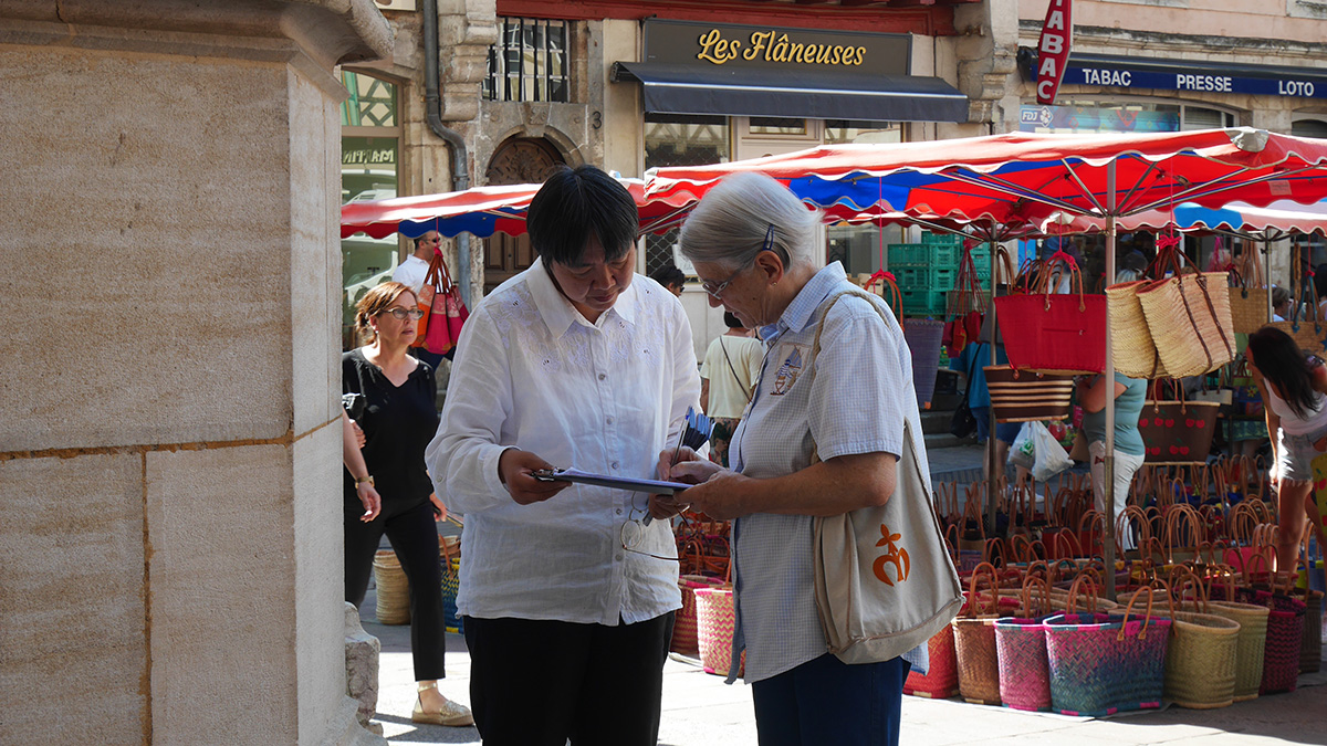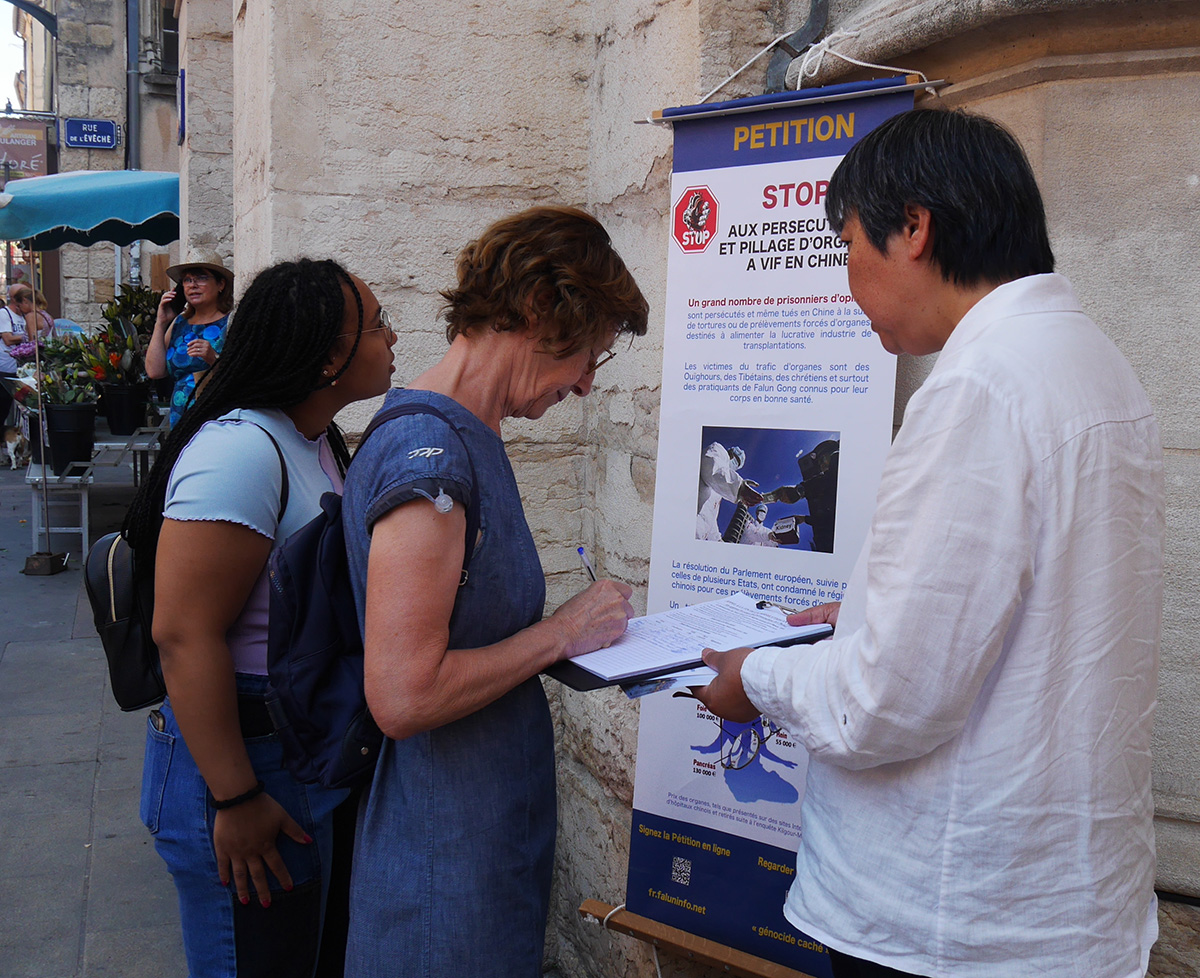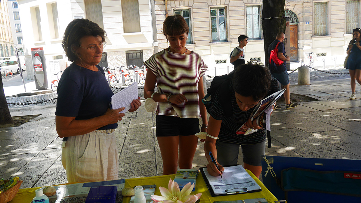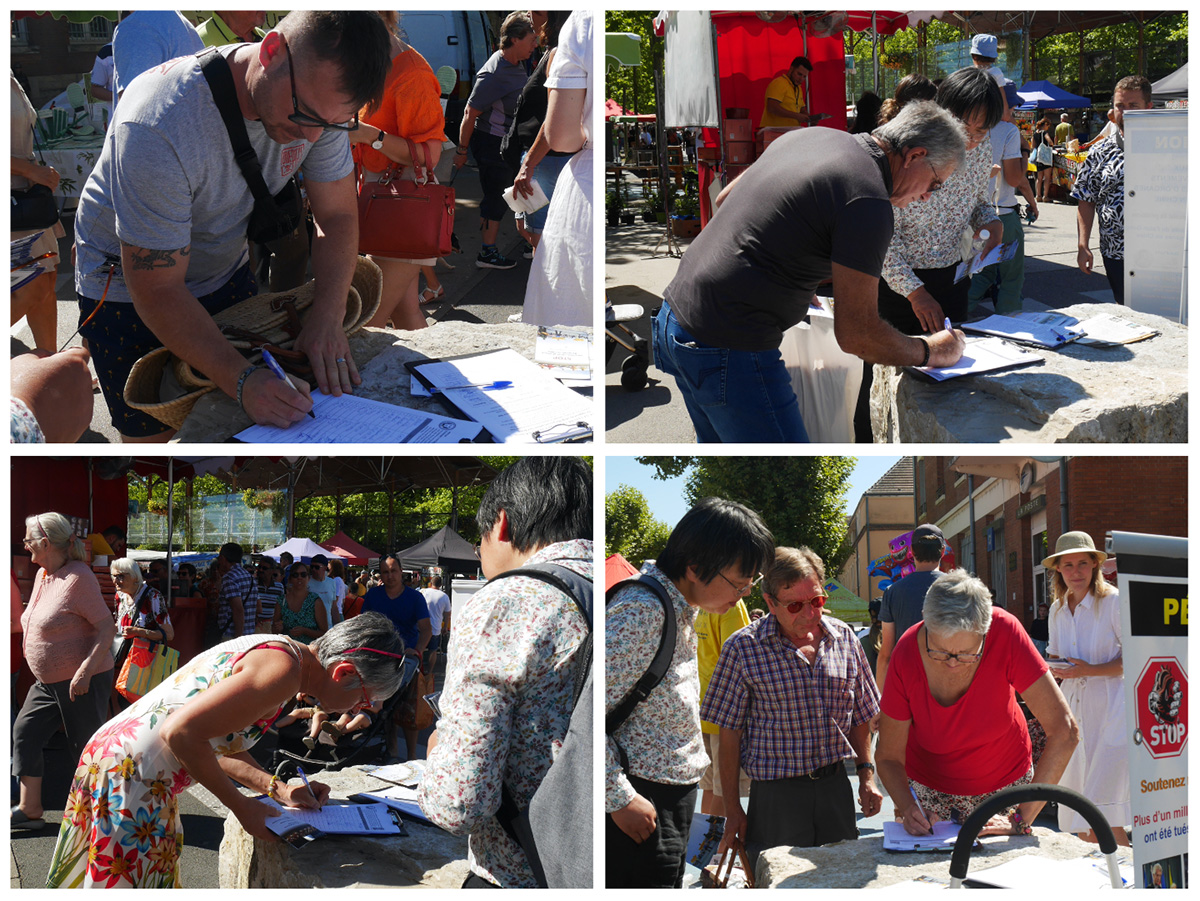 一位年长的法国女士见到法轮功学员非常高兴,她说三年前曾经在贝桑松(Besançon)火车站见到法轮功学员,知道真相。她在征签表上签字后说:“活摘器官,这不是人能干出来的事情。”她感叹,“人类如此下去,将走向何处?”