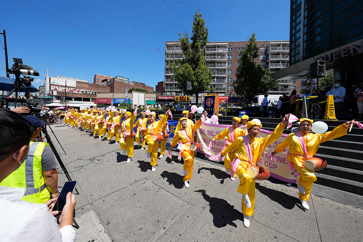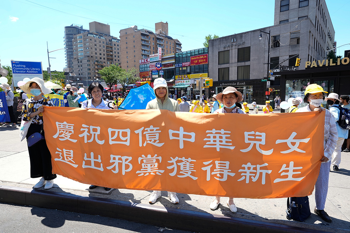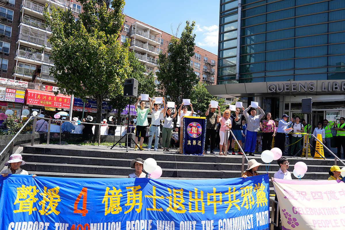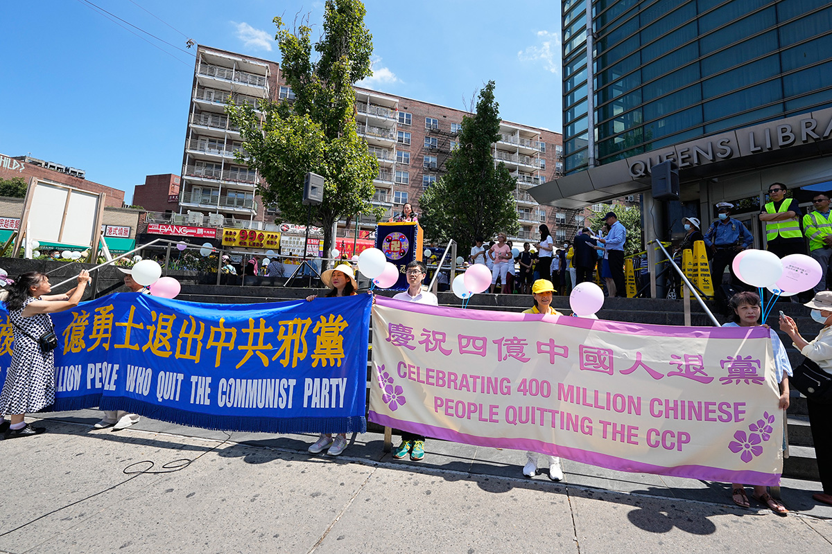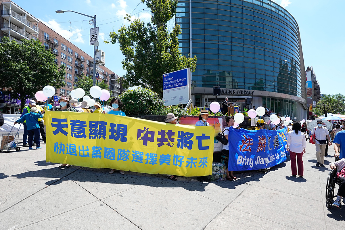 当日,法拉盛街头,车水马龙。图书馆前锣鼓喧天,人头攒动。退!党!义工、社会正义人士、社区领袖、现场公开退!党!人士等数百人参加了集会和庆祝活动,众多路人观看集会并表达声援。现场巨型横幅“声援4亿勇士退出中共邪*党-”,“庆祝4亿中国人退出中共”等横幅特别醒目。