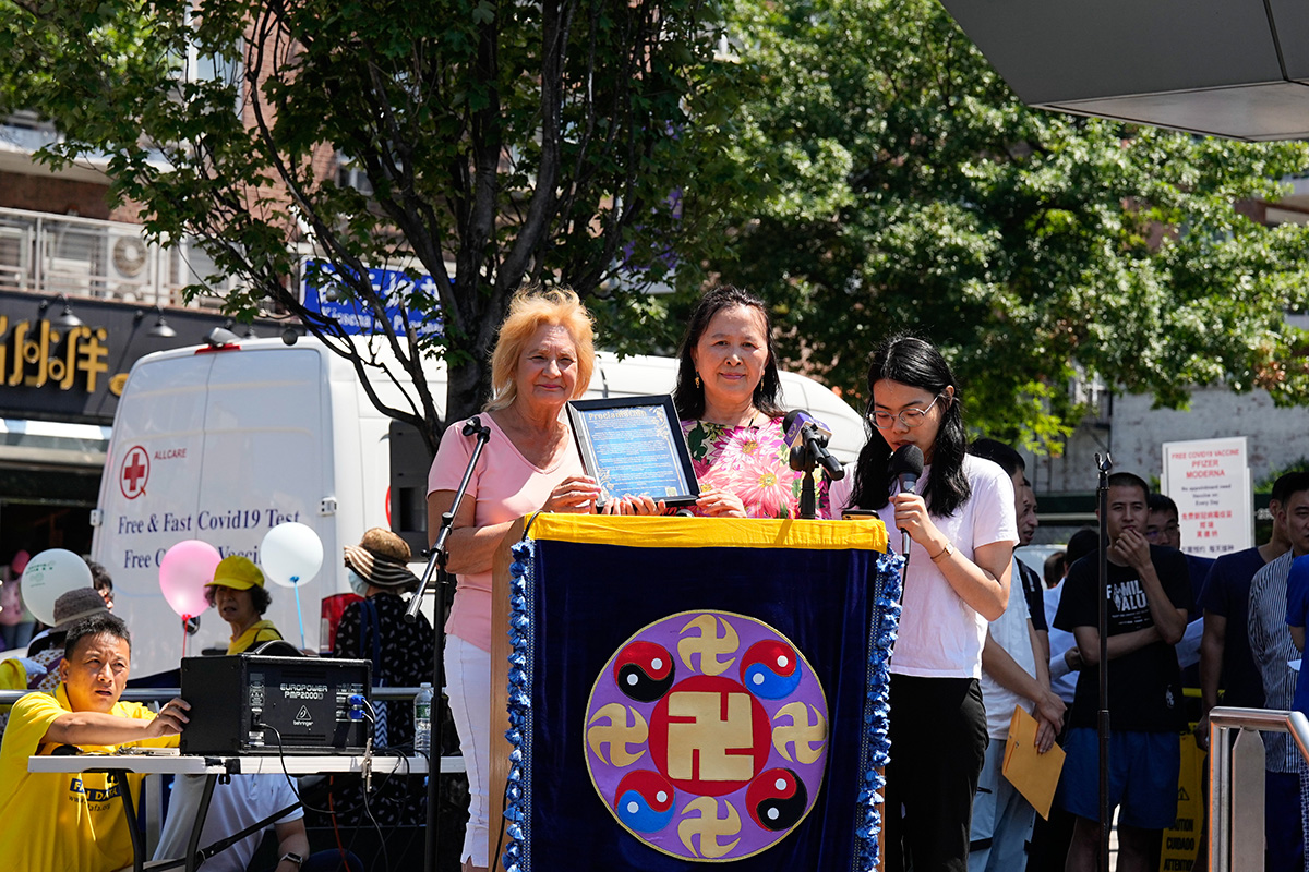 社区领袖玛莎为全球.退:党!服务中心颁奖。玛莎表示,退!党!运动是人类文明史上最大的草根性运动,通过和平理性非暴力促进中国的转型,带来人民的觉醒。我们需要结束所有的伤害,需要结束阻止言论自由的专制,在这里她热烈祝贺四亿中国人获得自由。