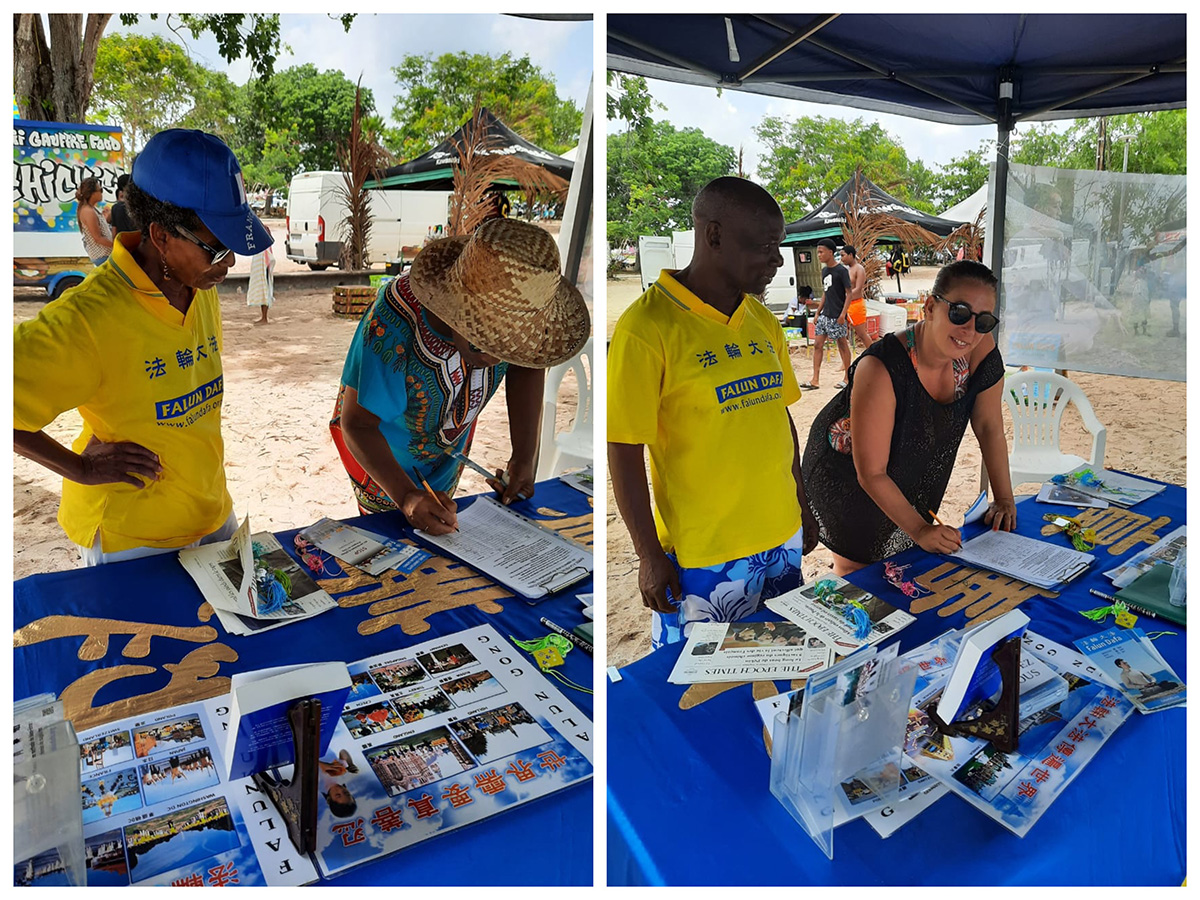 苏弗莱尔海滩的游人中有欧洲游客、回家乡度假的瓜德路普人,还有本地民众。法轮功学员从海滩的一头走到另一头,向在海边游泳歇息、野餐的人们发法轮功真相资料,征签。很多人都表示想学炼法轮功,并签字支持反迫害。