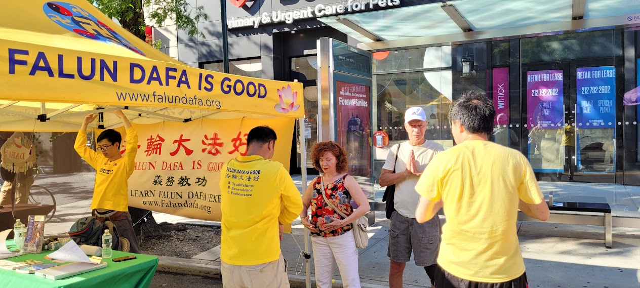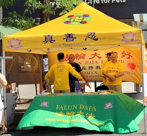 从早上十点到下午六点,虽然是盛夏酷日当头,法轮功展位前的功法展示一直没停。烈日下,法轮功学员们向人们介绍法轮功,并且征集签名制止迫害。舒缓整齐的功法展示立即吸引纽约街市上人们的关注。很多人接受介绍大法传单,还有一些人当场学功。