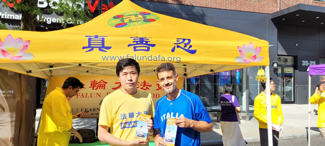 在位于30街和31街之间的街道上,有出售果汁、当地食物和手工工艺品等。法轮功学员利用这次机会也接触了很多参展摊位和当地的华人餐厅。人们表示很高兴在这的集市上还有法轮功这一个元素,丰富当地的人文感觉。学员们的善良也打动了他们,不少当地人与参展商了解了真相后,纷纷与法轮功学员合影,给纽约的街市带来不一样的亮丽色彩。
