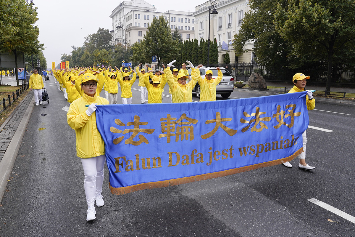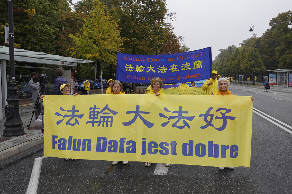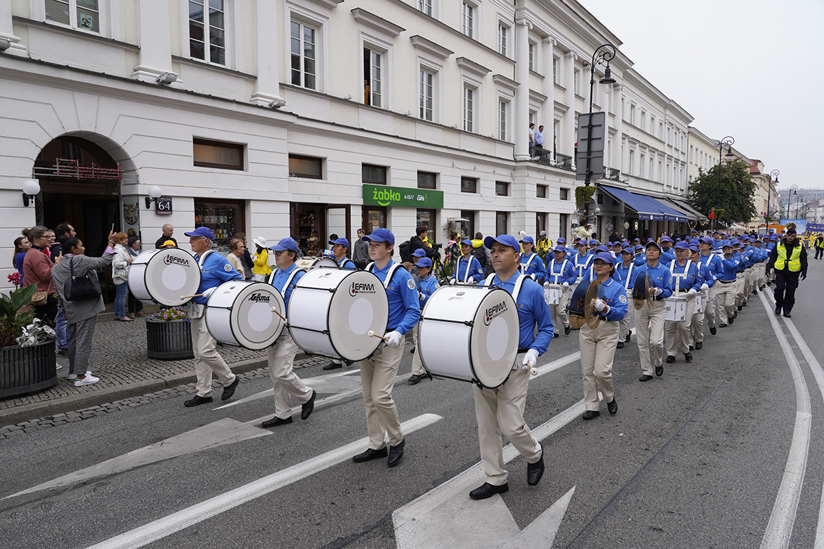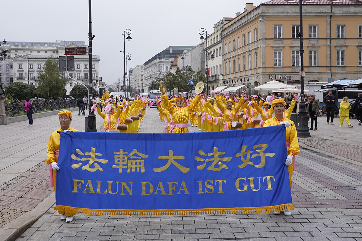 当天正午时分,来自欧洲三十多个国家的逾千名法轮功学员走上华沙街头。他们沿途经过首相府、使馆区,华沙大学正门前,最后到达古城区。队伍最前方天国乐团嘹亮的乐声,后面有学员们随着优美音乐的功法展示。还有来自欧洲各国的学员身着传统服装,打着用自己母语的横幅。游行方阵中,揭露中共迫害罪行的大幅展板,肃穆悼念二十三年来被中共迫害致死的法轮功学员的白衣女士们,在队伍尾部威风凛凛的舞龙和精神抖擞的舞狮,及压阵的腰鼓队,都吸引着华沙街头的众多路人。他们纷纷掏出手机,记录这一独特的场景。
