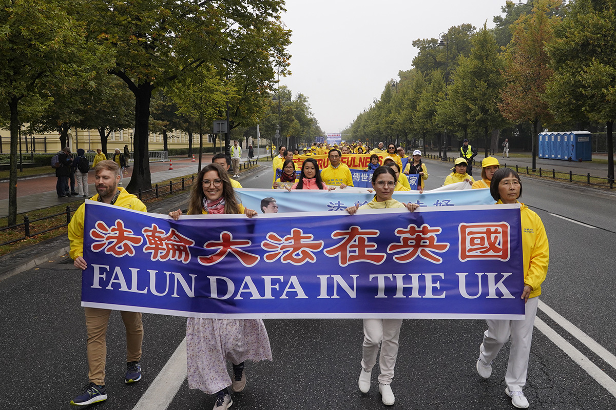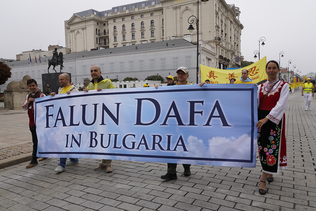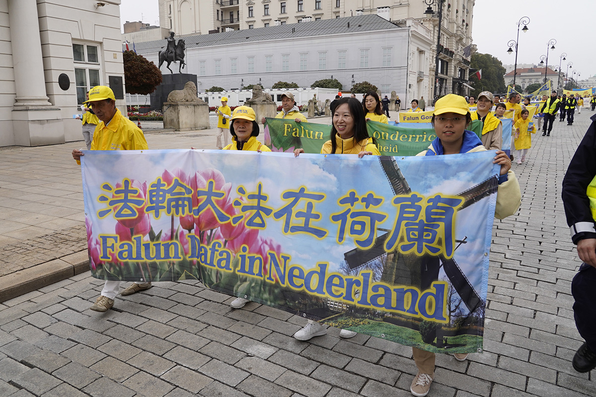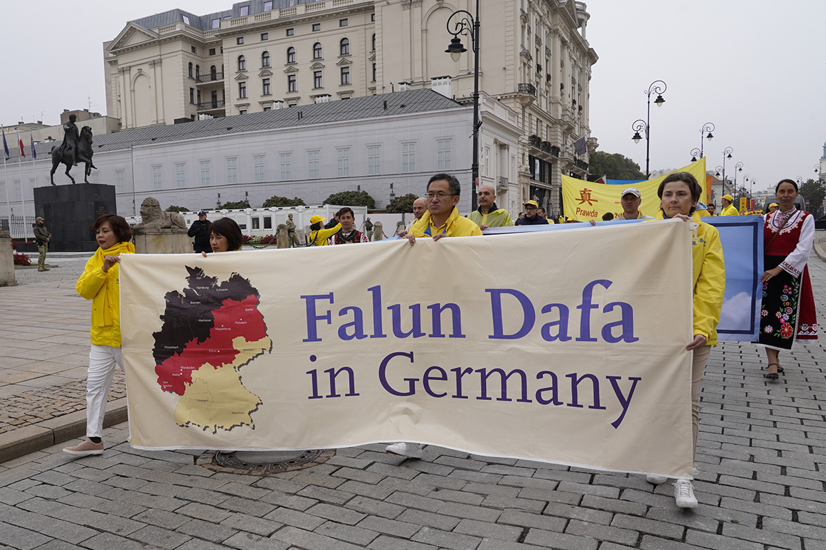 当天正午时分,来自欧洲三十多个国家的逾千名法轮功学员走上华沙街头。他们沿途经过首相府、使馆区,华沙大学正门前,最后到达古城区。队伍最前方天国乐团嘹亮的乐声,后面有学员们随着优美音乐的功法展示。还有来自欧洲各国的学员身着传统服装,打着用自己母语的横幅。游行方阵中,揭露中共迫害罪行的大幅展板,肃穆悼念二十三年来被中共迫害致死的法轮功学员的白衣女士们,在队伍尾部威风凛凛的舞龙和精神抖擞的舞狮,及压阵的腰鼓队,都吸引着华沙街头的众多路人。他们纷纷掏出手机,记录这一独特的场景。