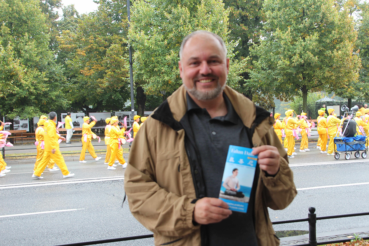 从波兰南部来华沙探望儿子的产品经理罗伯特·斯维泰克(Robert Świątek)和太太也用手机录下了法轮功学员的游行队伍。“非常好的游行,游行队伍中的人们都脸带笑容,非常平和的参加游行,这让人感到平静。”他希望所有的抗议游行都能如此的平和、安静。他认为这样的游行应该在各地传播让人能够有礼的相处。