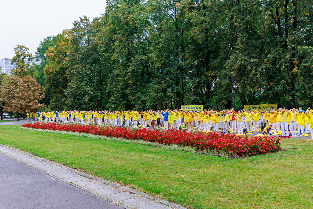 “身穿黄色衣服炼功人,远远看去一片明亮的黄色,给人印象深刻,我感受到一种宁静、祥和的能量,很舒服。”一位在公园里散步的波兰女士对记者说。