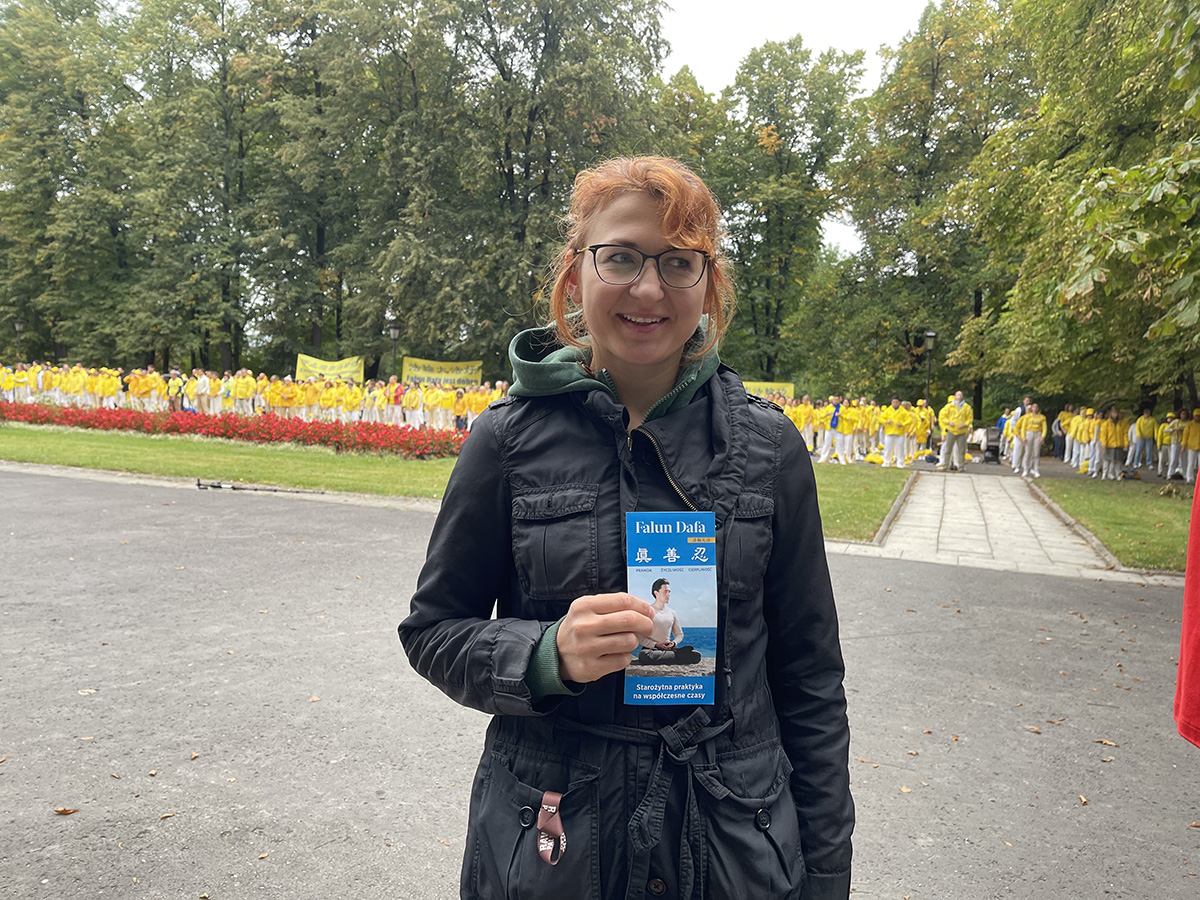一位波兰在读大学生也表达,看到这么多人在炼功,一种很安静,很纯净,安详感觉。他认为信仰是人的基本权利,波兰人有过共产党统治的困难经历。对法轮功的迫害必须停止。