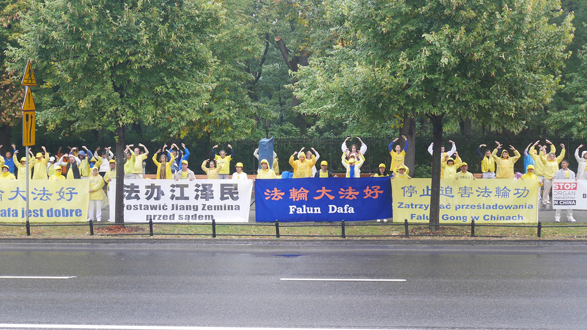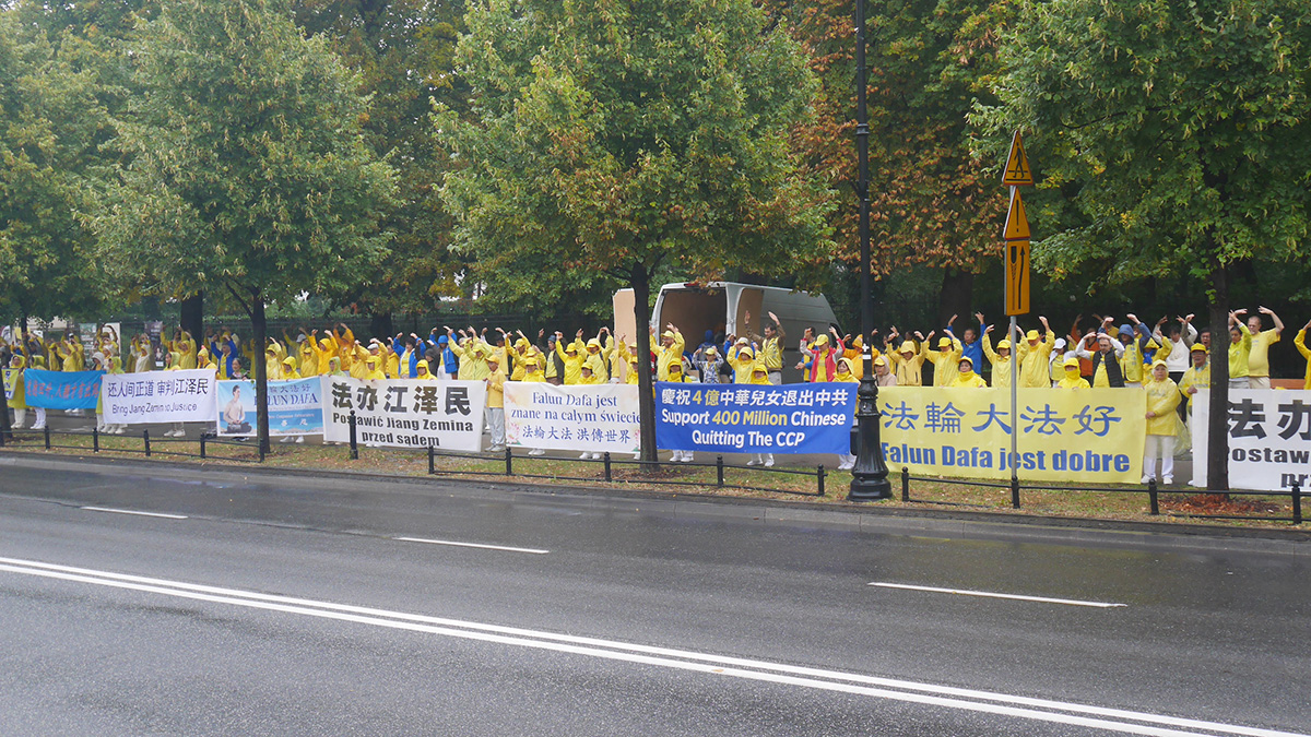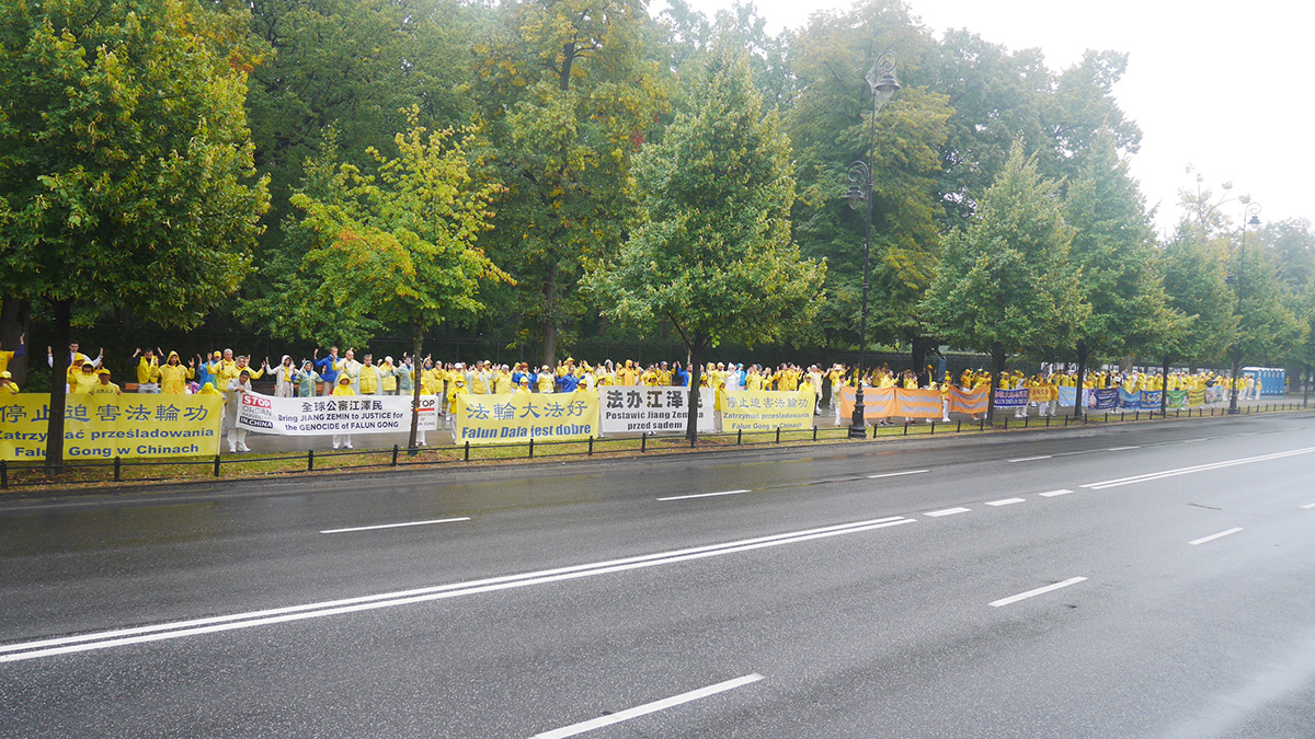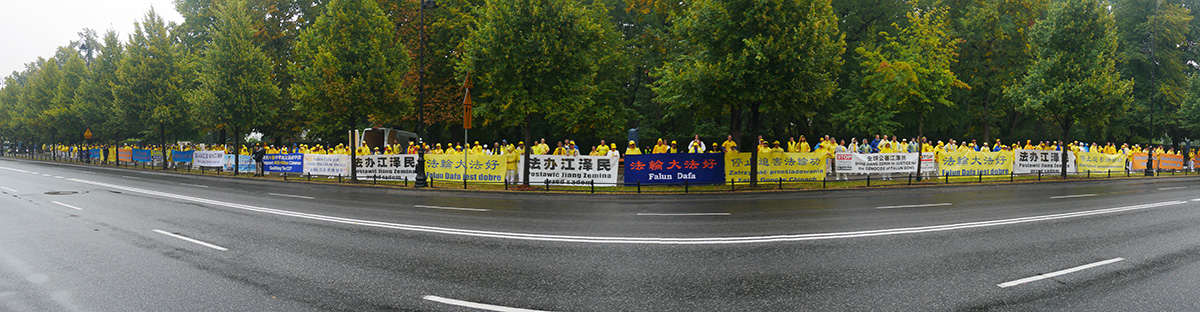 华沙是波兰的政治和经济中心,总理府坐落在林荫大道上。路旁宽阔的林荫人行道上,千名法轮功学员面容祥和,在绵绵细雨中展示舒缓优美的功法。炼功人群中有年逾七十的老年学员,也有几岁大的大法小弟子。