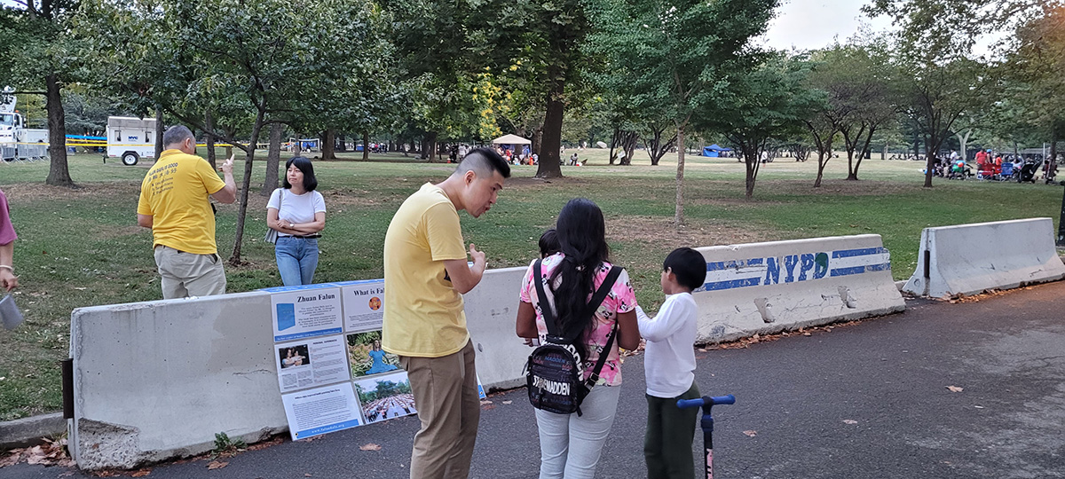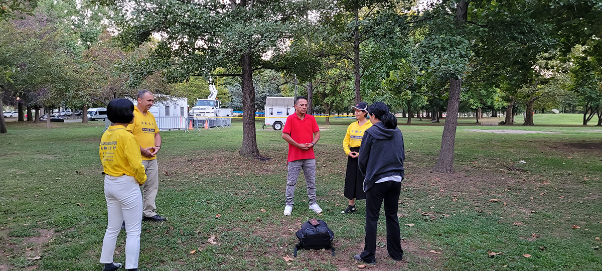 阿凡佐(Alfanzo)路过公园里的法轮功学员,停下来看法轮大法功法的告示牌。一位学员开始与他交谈,并介绍了更多有关法轮功的信息。