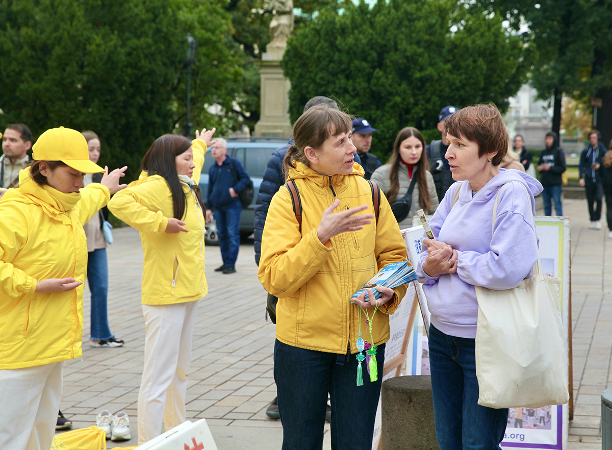 她们说因为一会儿要在这附近参加演出路过这里,看到法轮功学员静坐就停了下来。当她俩得知中共不允许人们修炼真、善、忍时,都觉得很无语,科莫若斯卡女士说,“在中国,人们由于信仰这些原则(真、善、忍)遭受迫害,真是个悲剧。”
