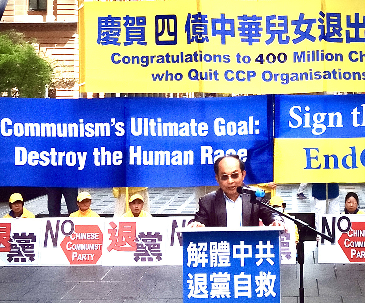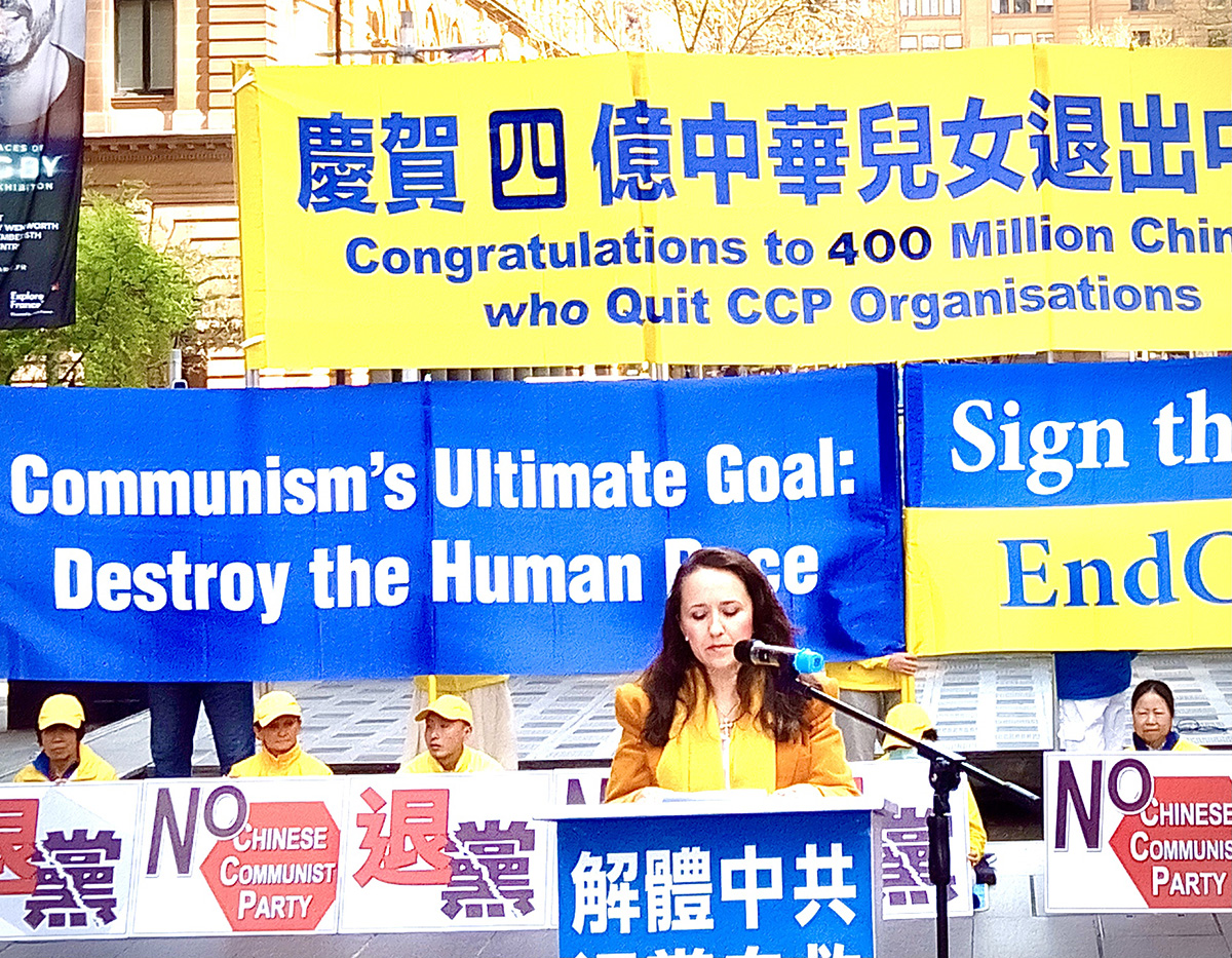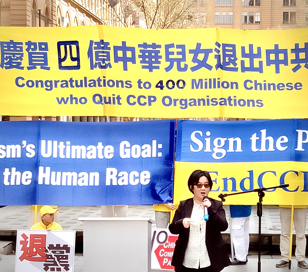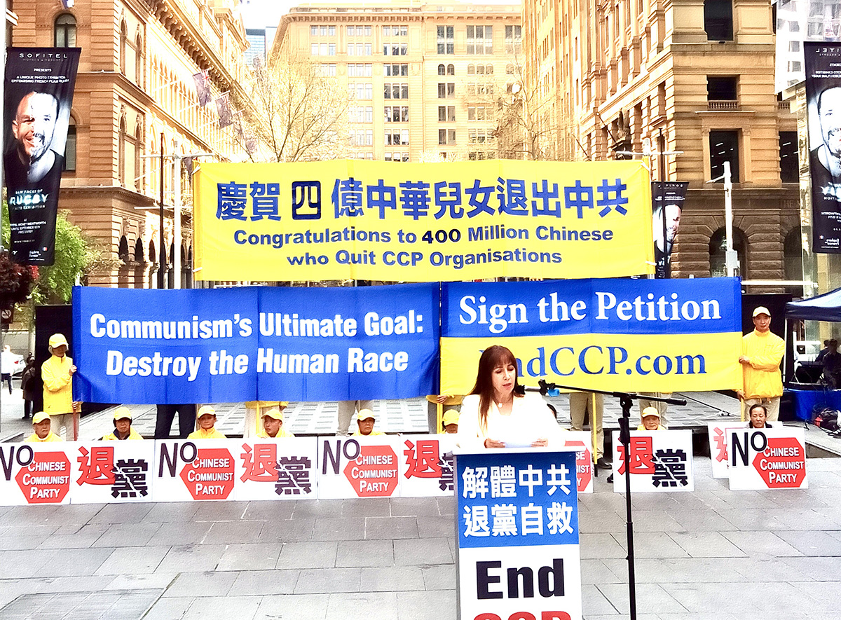 悉尼退!党!中心代表乔安娜(Joanna Zhou)在发言中说:“四亿中国人以难以置信的智慧和勇气退出了中共党、团、队组织(三:退.)。这是一个里程碑,为中国社会向和平时期过渡带来积极的改变。”