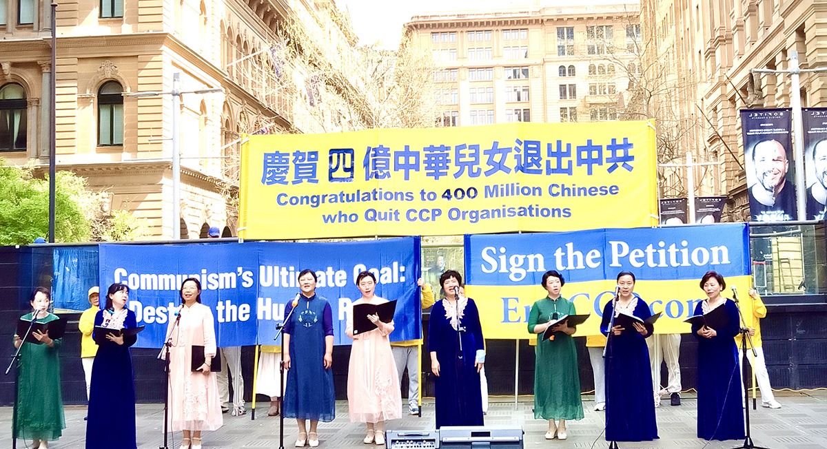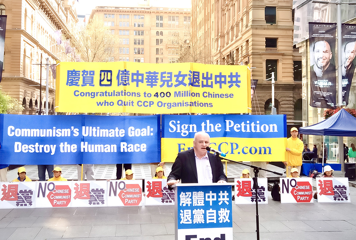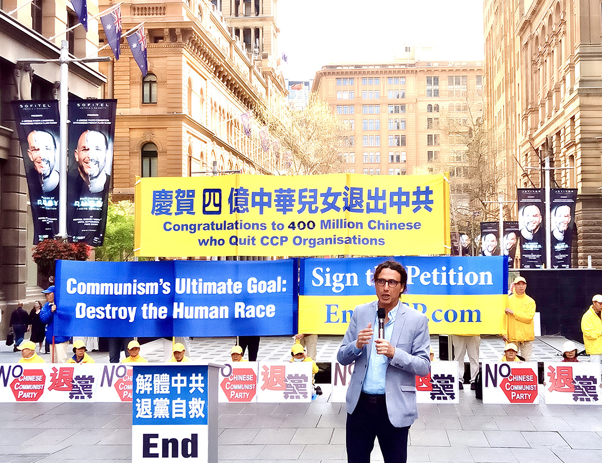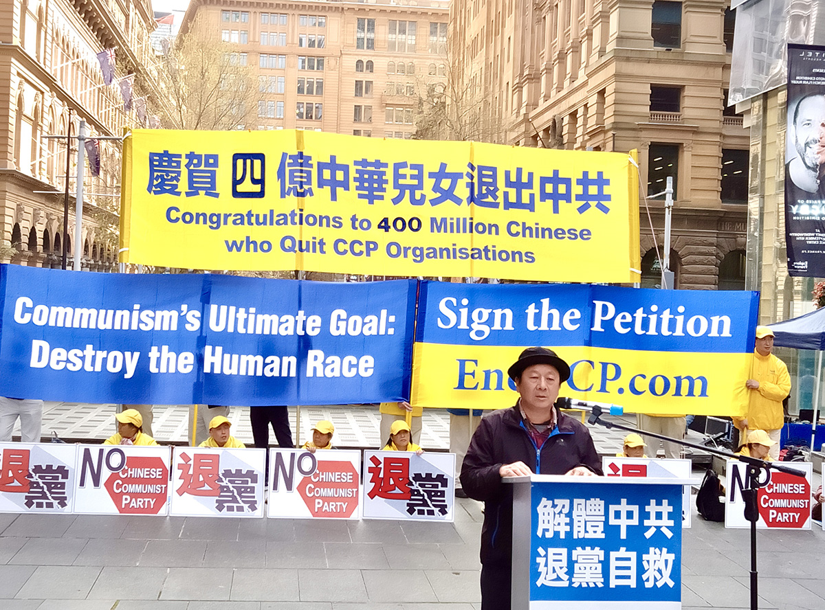 悉尼退!党!中心代表乔安娜(Joanna Zhou)在发言中说:“四亿中国人以难以置信的智慧和勇气退出了中共党、团、队组织(三:退.)。这是一个里程碑,为中国社会向和平时期过渡带来积极的改变。”