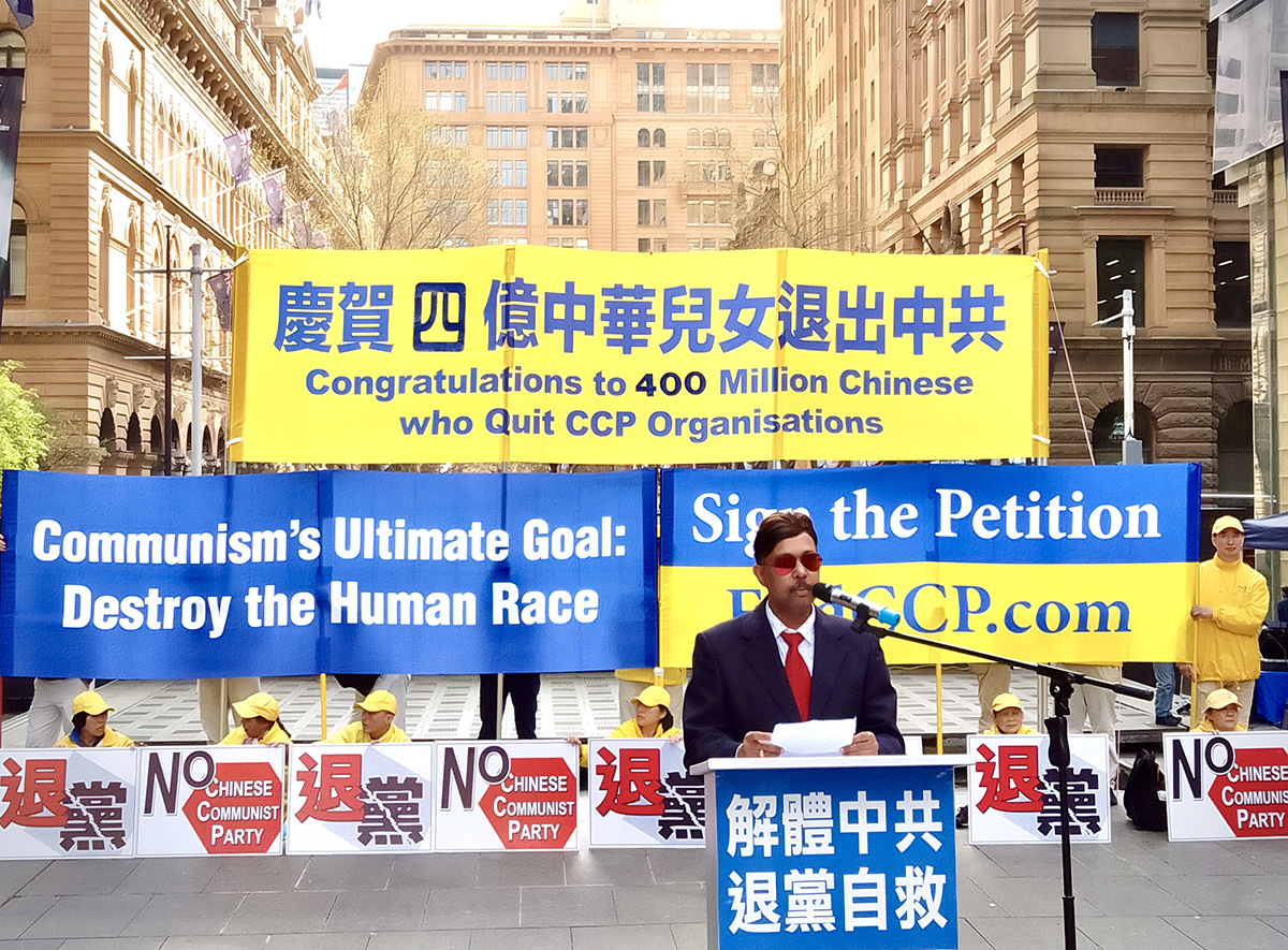 前澳洲帕拉玛塔市联邦候选人、企业家洛克(Ganesh Loke)表示:“法轮功受到中共的长期残暴杀戮,但是他们坚持不懈反对中共的迫害,并且声势越来越大,正如你所看到的,有四亿多中国人退出了中共,这是一个伟大的里程碑。”