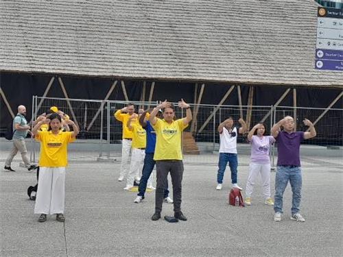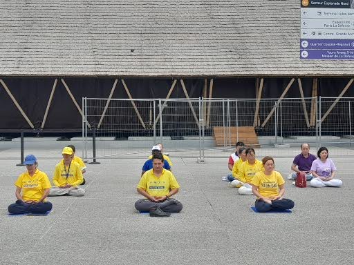 ![]() 图1:法轮功学员在巴黎郊区拉德芳斯(La Défense)广场举行集会活动,向游人和民众展示法轮功功法,揭露中共迫害法轮功罪行。 |