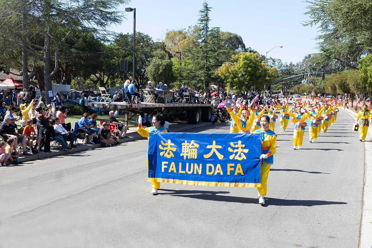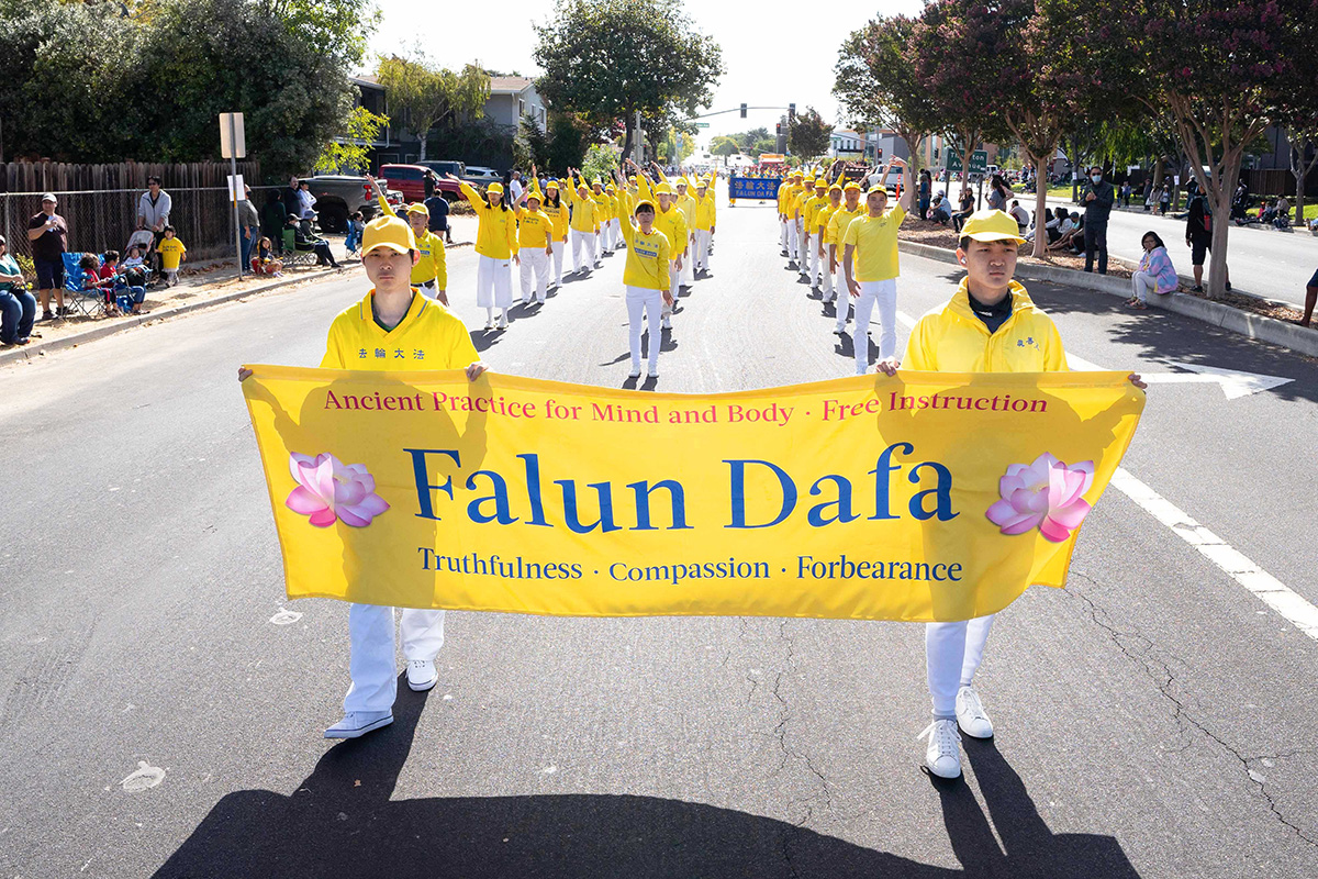 法轮功学员的队伍经过主席台时,主办方介绍说,“法轮功也称法轮大法,是中国传统修炼功法,包括道德教导和缓慢的功法,能帮助人改善身心健康。法轮功的原则是真善忍。他们带来了炼功队、腰鼓队和装饰美丽的花车,我喜欢他们的队伍,很美,谢谢法轮大法的队伍,欢迎。”