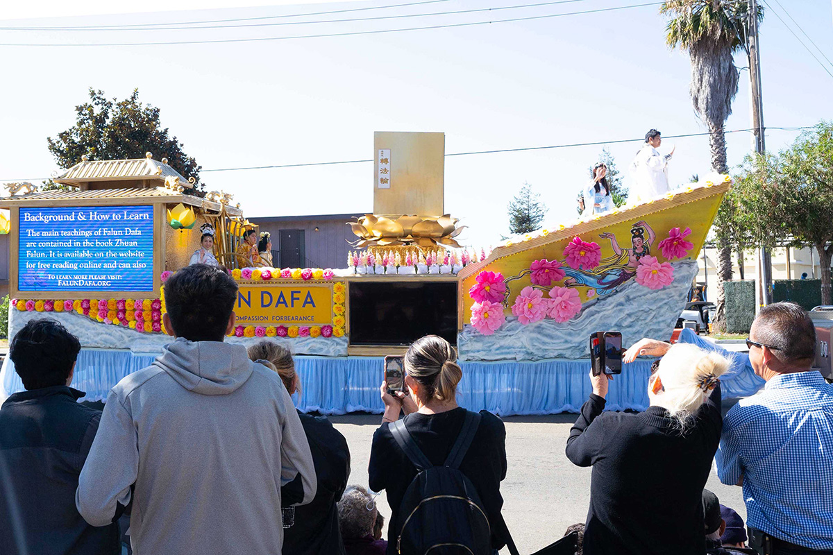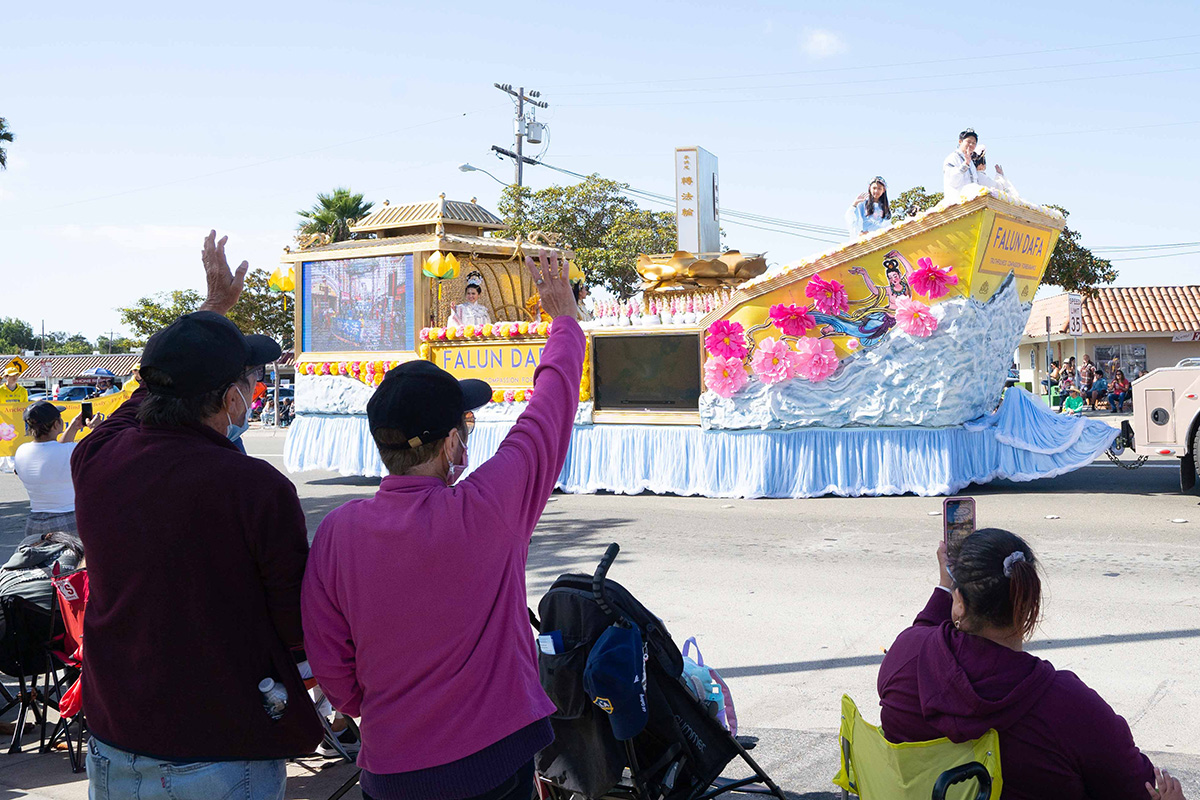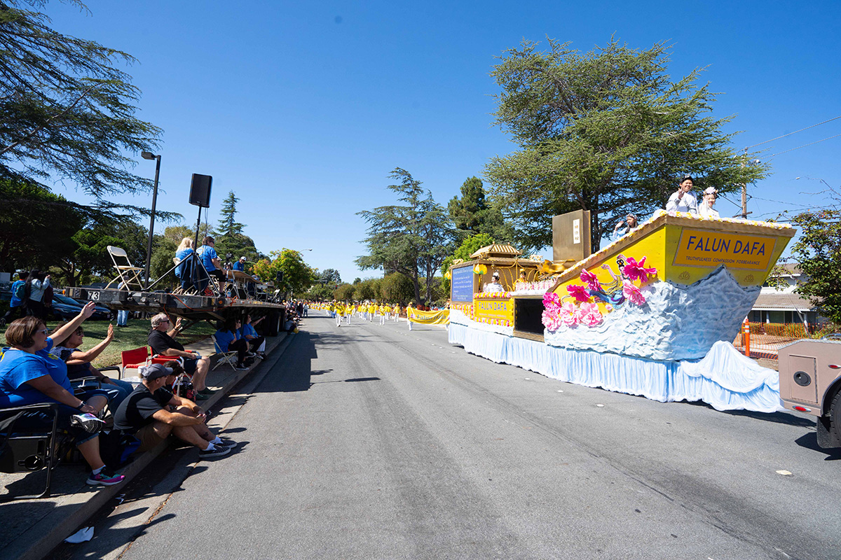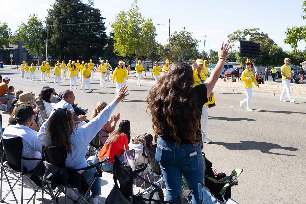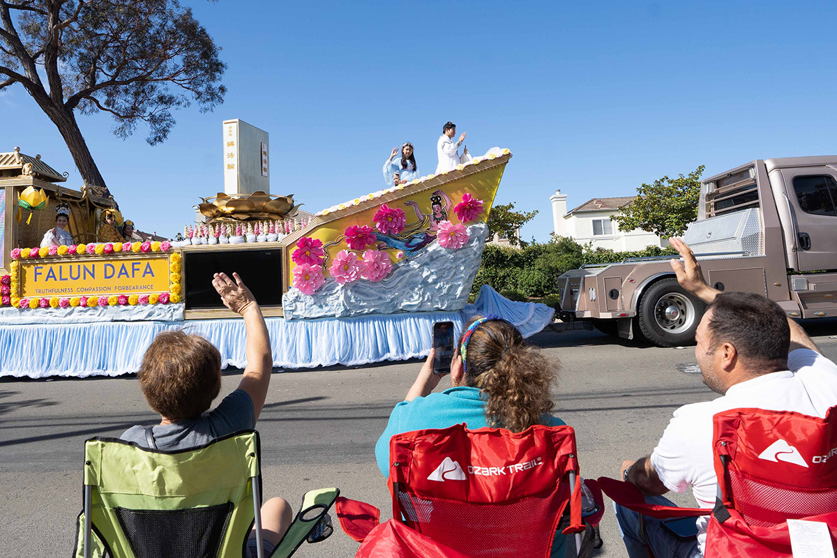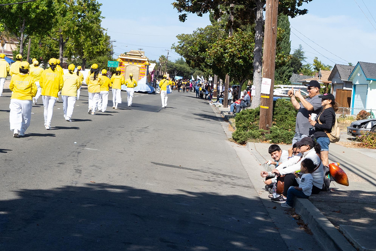 当天有八十二支队伍参加了游行。法轮功学员的队伍是当天游行中最大的队伍之一,有花车、炼功队和腰鼓队。当法轮功的队伍出现时,人们的眼睛为之一亮:太漂亮了。他们欢呼着,并竖起大拇指:这就是我们需要的;有的观众还向法轮功学员的队伍鞠躬;有的随着法轮功学员的炼功动作比划着。还有的观众不断挥手、拍照。