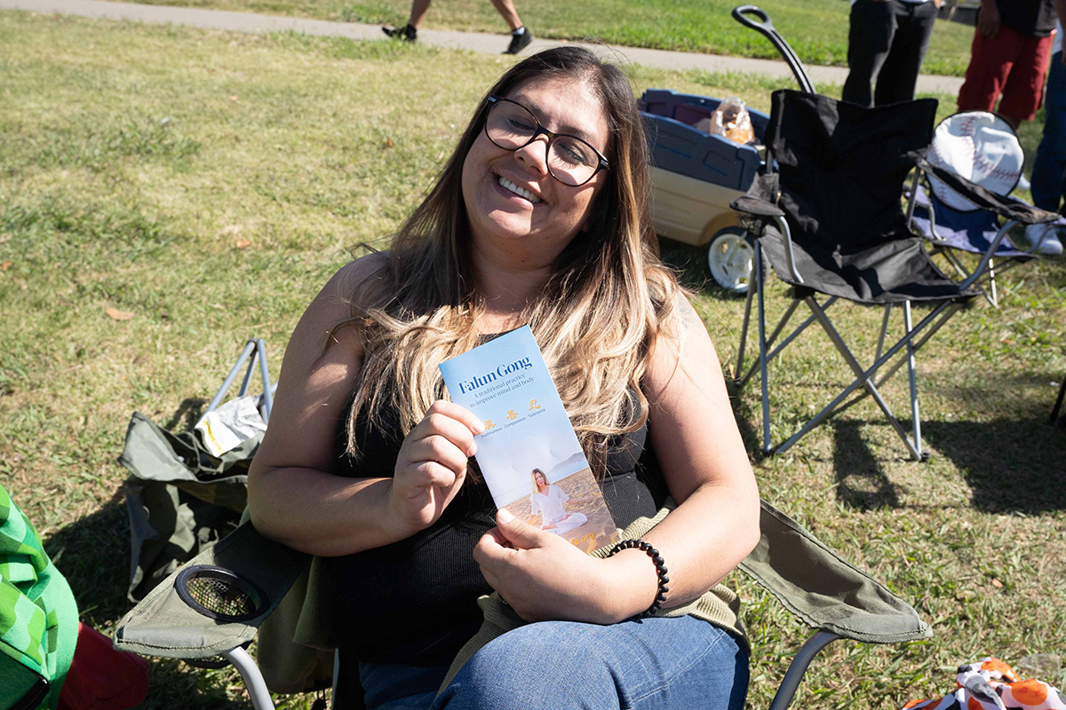 当坐在折叠椅上观看游行的凡妮莎(Vanessa)听到法轮功可以帮助人们缓解焦虑和压力时,非常高兴,她说,“我需要这个,我喜欢这支队伍,我喜欢法轮功的真善忍原则,我非常想学法轮功,这正是我需要的,我会在家炼。”