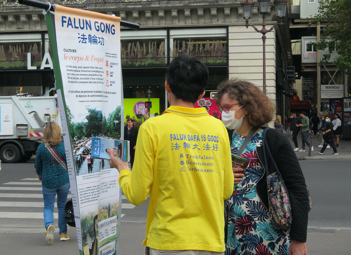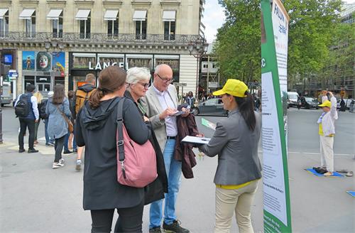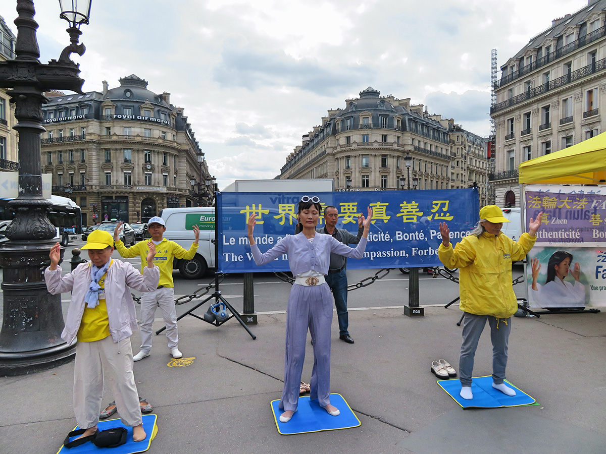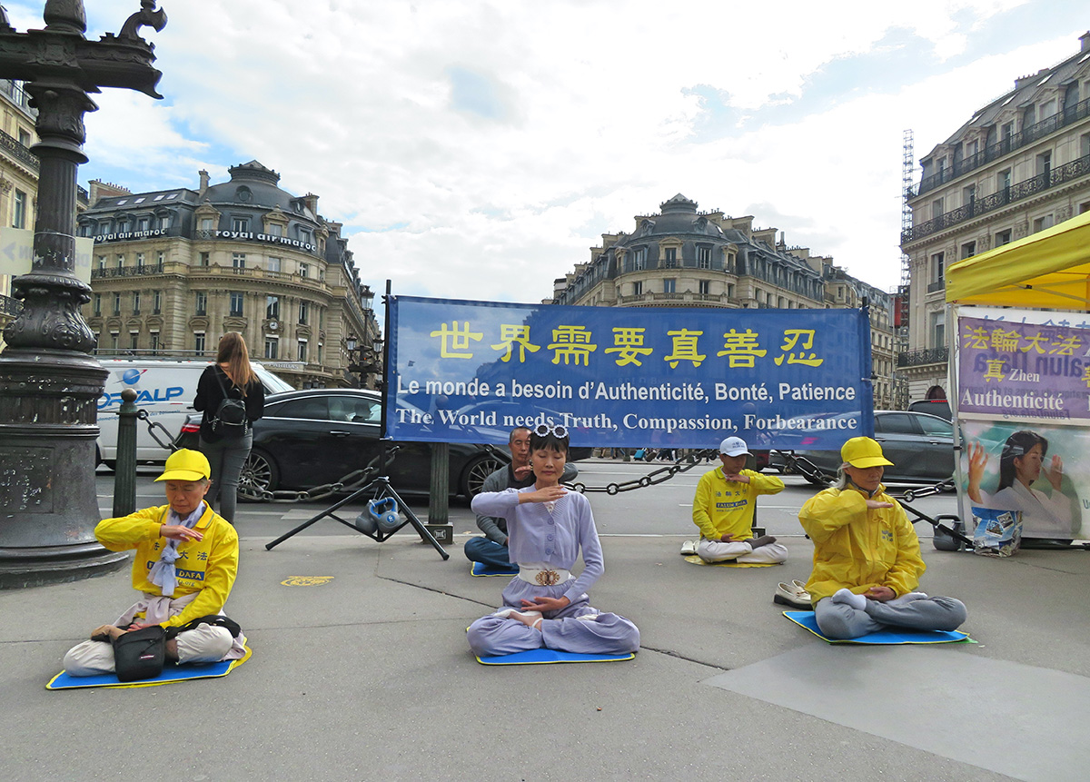 巴黎歌剧院位于巴黎市中心,来往人流不断。闹市中,法轮功学员平静、祥和的炼功,引人注目,很多人打听怎样开始炼法轮功,其中有在役军人、大学生,还有其它职业的人。人们听说中共酷刑折磨法轮功学员,甚至强行摘取他们的器官牟取暴利,非常震惊,他们在反迫害征签表上签字,希望能为停止迫害助一臂之力。