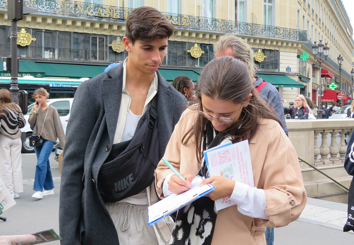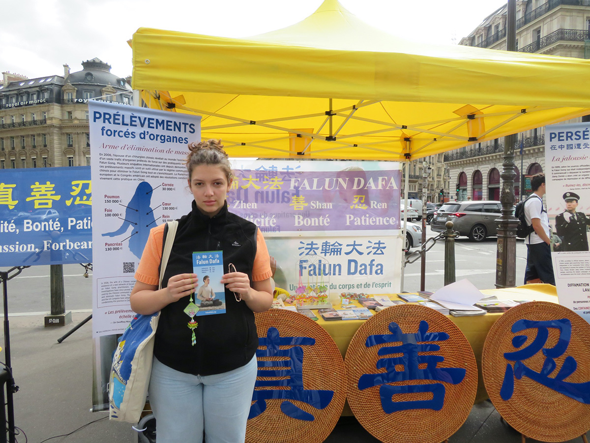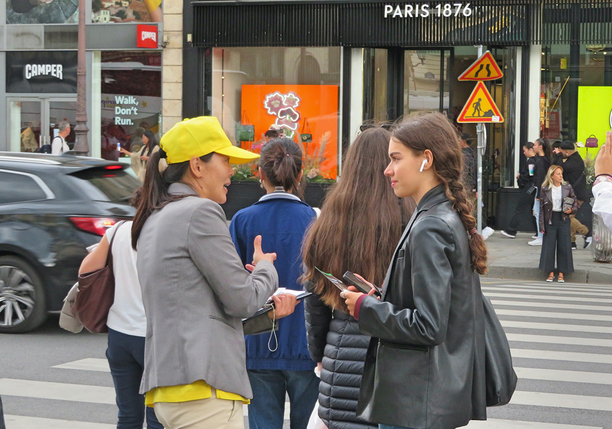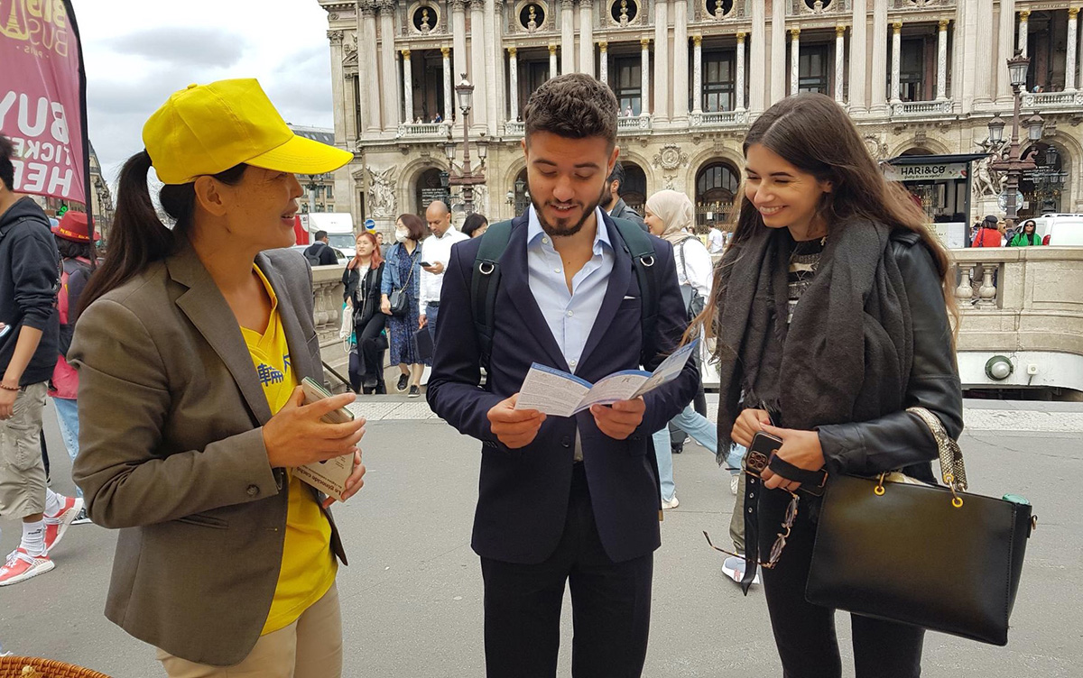 巴黎歌剧院位于巴黎市中心,来往人流不断。闹市中,法轮功学员平静、祥和的炼功,引人注目,很多人打听怎样开始炼法轮功,其中有在役军人、大学生,还有其它职业的人。人们听说中共酷刑折磨法轮功学员,甚至强行摘取他们的器官牟取暴利,非常震惊,他们在反迫害征签表上签字,希望能为停止迫害助一臂之力。