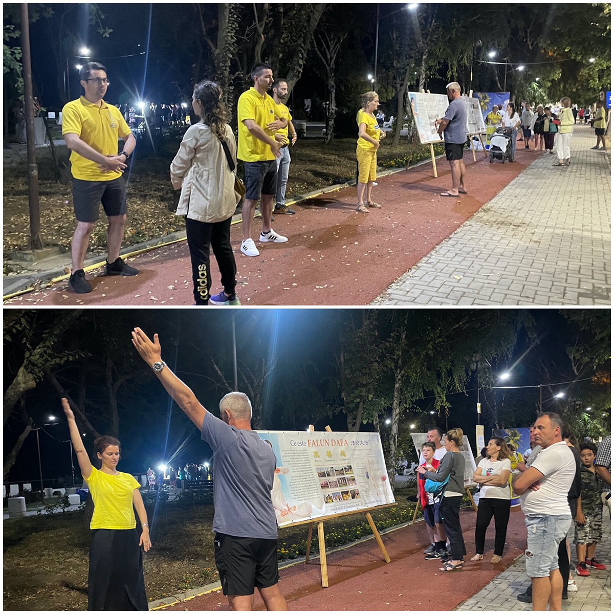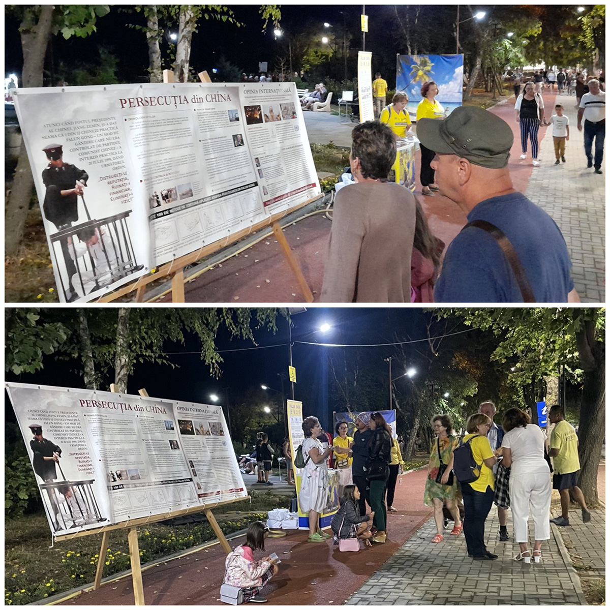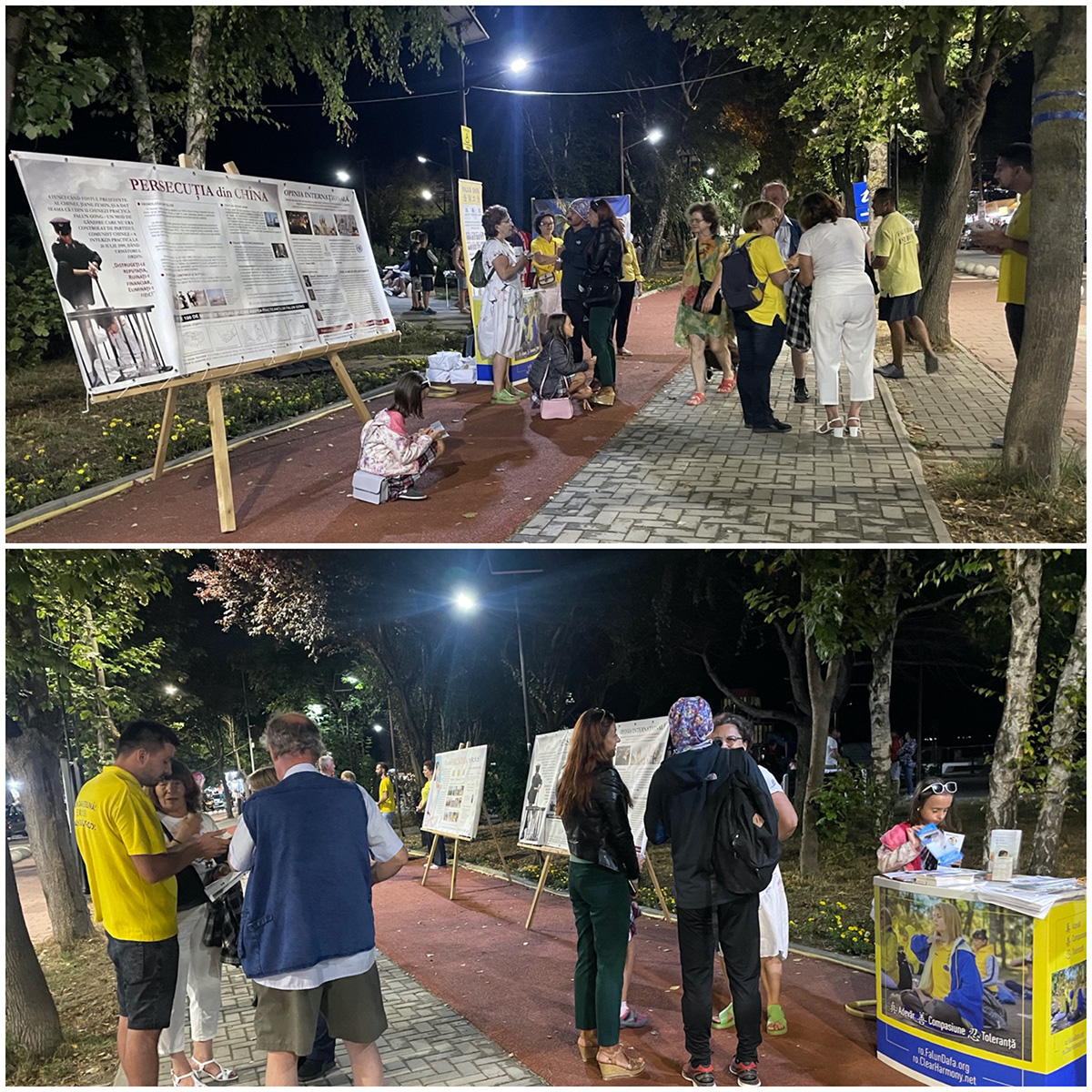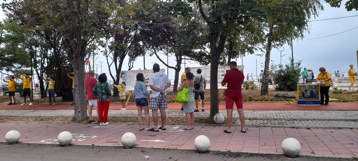 二零二二年八月十二日至十三日,法轮功学员在玛玛亚(Mamaia)海滨度假区举办弘法讲真相活动。有的学员演示法轮功功法,有的在给路人发资料,给有兴趣了解法轮大法的人讲真相。过往的游客,有的观看学员演示功法;有的阅读真相展板;有的了解真相后,在反对中共活摘法轮功学员器官的征签册上签名;也有的现场学功。