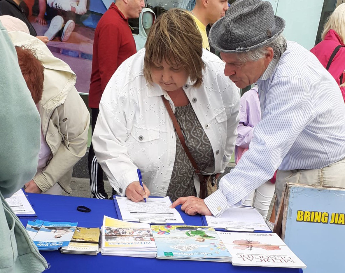 西人学员麦克一直在展板前向人们介绍法轮功,其中一个来自英国的家庭看了所有的展板,他们很困惑为什么在中国会发生这样残忍的迫害?麦克介绍中共的极权统治,在它领导下的人民没有信仰,不相信神的存在,而法轮大法教导人们按着真善忍去做好人,这些准则没有影响任何人,但中共很害怕,它不让人信仰真善忍和法轮大法。听了真相的人都在征签表上签名并带走了法轮功学员制作的小莲花。