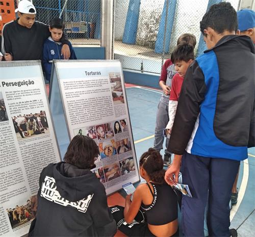 学生们通过法轮功学员带来的展板信息了解了中共对法轮功学员的残酷迫害,感到伤心和震惊,纷纷想为抵制这场迫害做点什么。学员们详细向学生讲述了二十三年来发生在中国大陆的对法轮功学员的持续迫害;说明了中共政权迫害法轮功学员,是因为学员们的道德标准很高,真、善、忍对比出了中共乖张暴戾的本性。