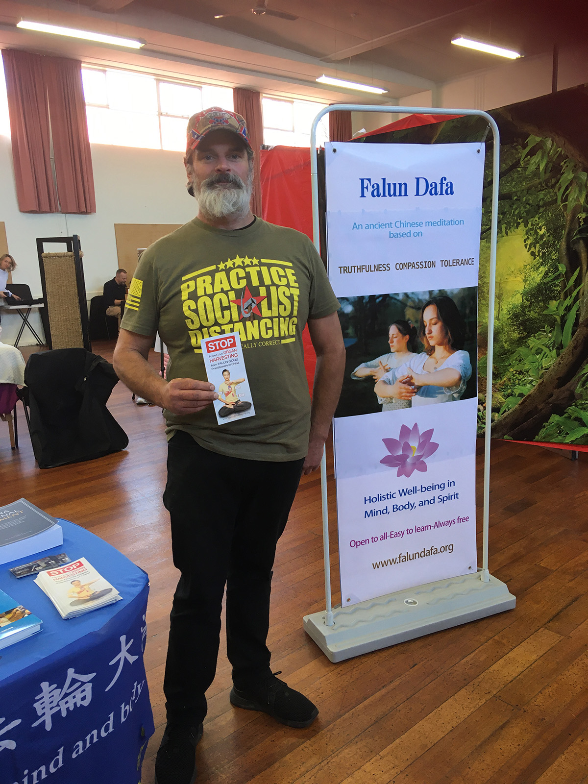 当地知名的声疗师凯文·所罗门(Calvin Solomon)也是当天活动的摊主之一,他特地来到法轮功展位,与学员攀谈,并签名支持反迫害。他说:中国是历史悠久与文化精深的国家,他们毛利人就来自中国,那里曾经是全世界心中的圣地。中国绝对不应该是现在这个样子,共产党对中国和中国人所做的事令神愤怒,它(共产党)应该从地球上消失。你们传播真相意义重大,知道的人越多,人们心中的力量团结在一起,神会看见,神会帮助好人扭转乾坤。凯文对中共活摘法轮功学员器官的罪恶感到震惊,他认为这是邪恶至极,他将告诉身边的人,让大家都为法轮功学员祈祷。