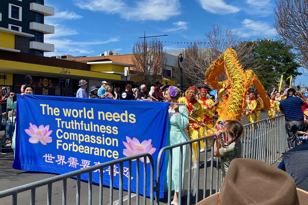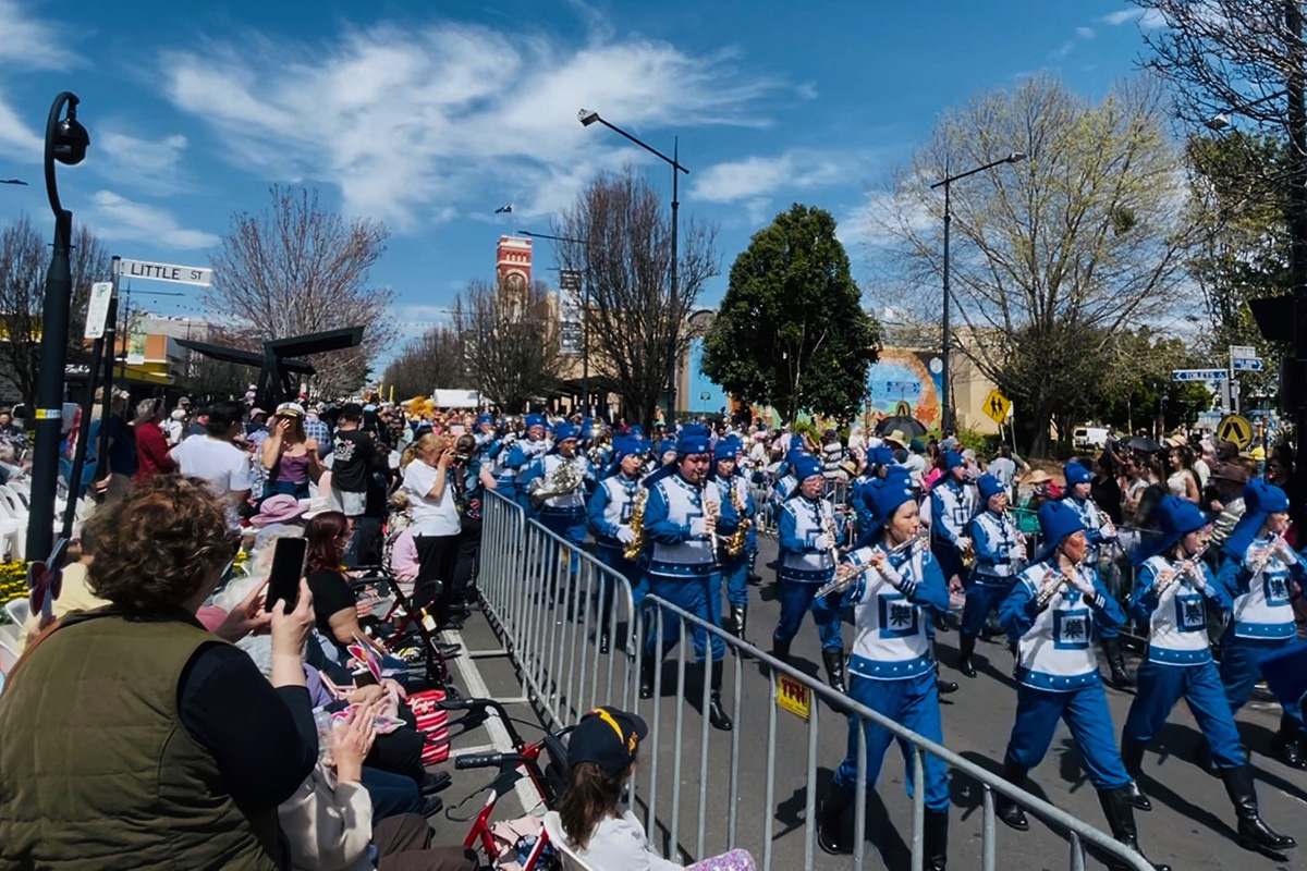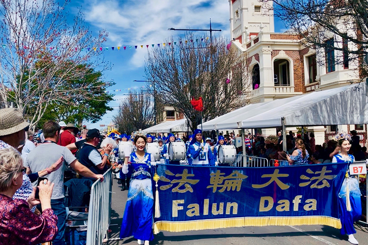 法轮功游行队伍由澳洲天国乐团、舞龙队、腰鼓队和锣鼓队等组成,阵容壮观,充满活力。天国乐团的演奏充满能量,旋律雄壮有力,为当地民众带来了《法轮大法好》、《佛恩圣乐》等乐曲。大法小弟子身穿中国各民族服饰,手持展板传递着“法轮大法好”,“世界需要真、善、忍”的信息。