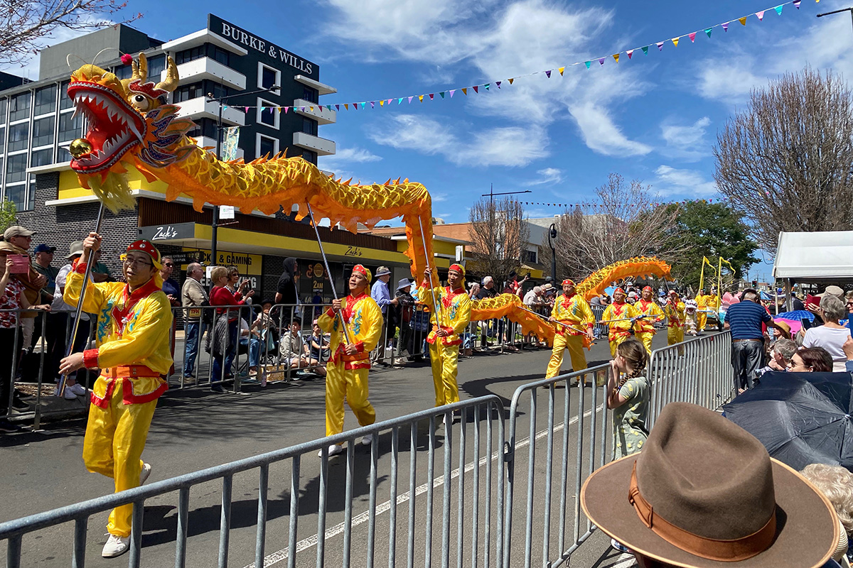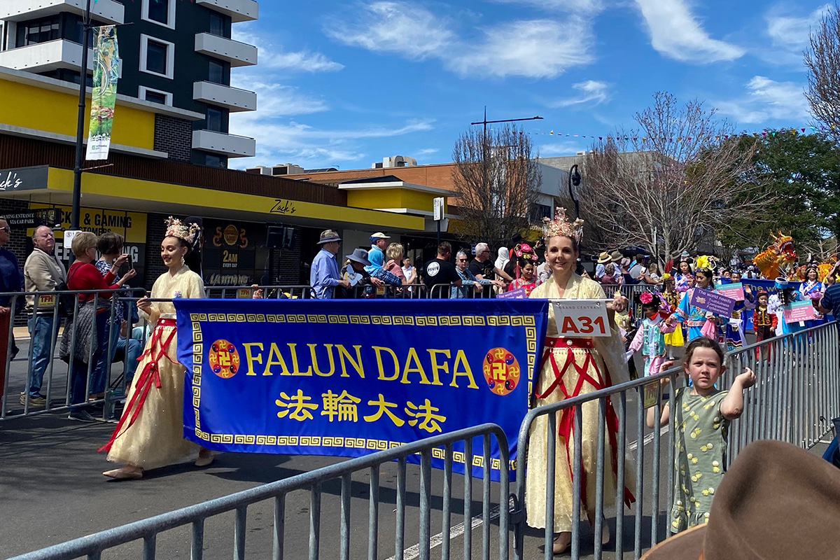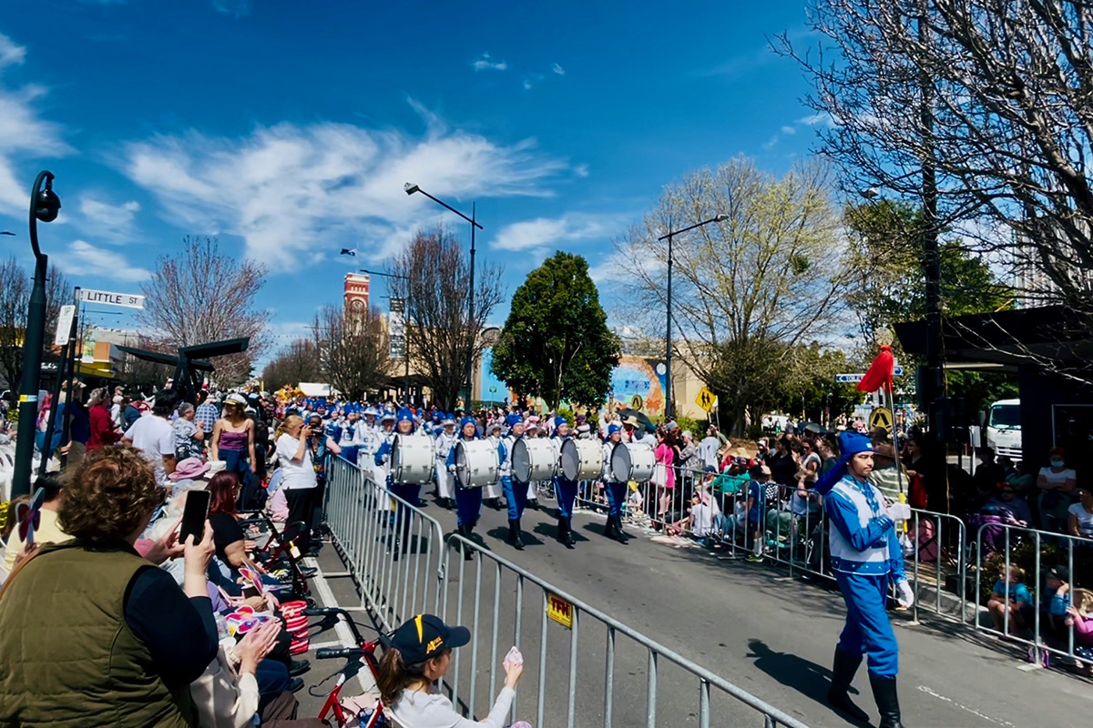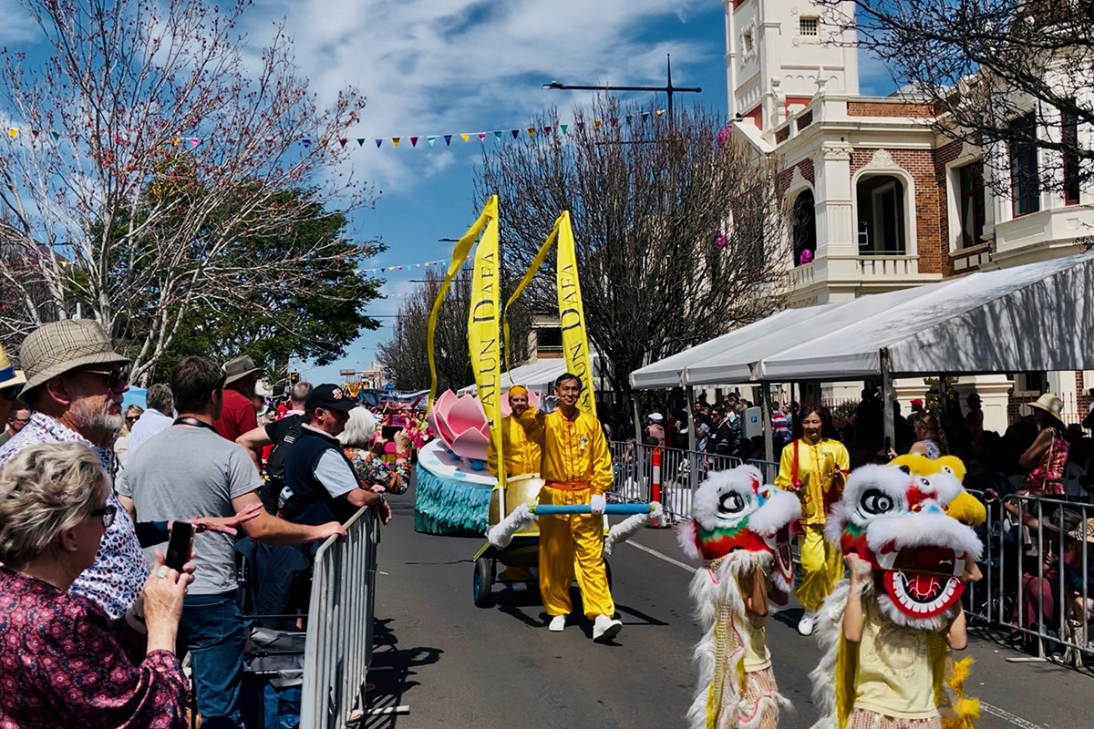 法轮功游行队伍由澳洲天国乐团、舞龙队、腰鼓队和锣鼓队等组成,阵容壮观,充满活力。天国乐团的演奏充满能量,旋律雄壮有力,为当地民众带来了《法轮大法好》、《佛恩圣乐》等乐曲。大法小弟子身穿中国各民族服饰,手持展板传递着“法轮大法好”,“世界需要真、善、忍”的信息。
