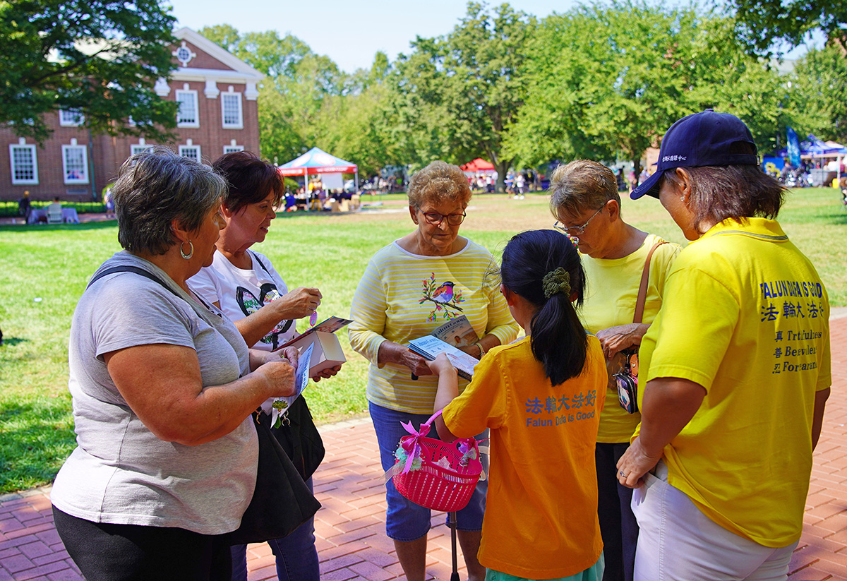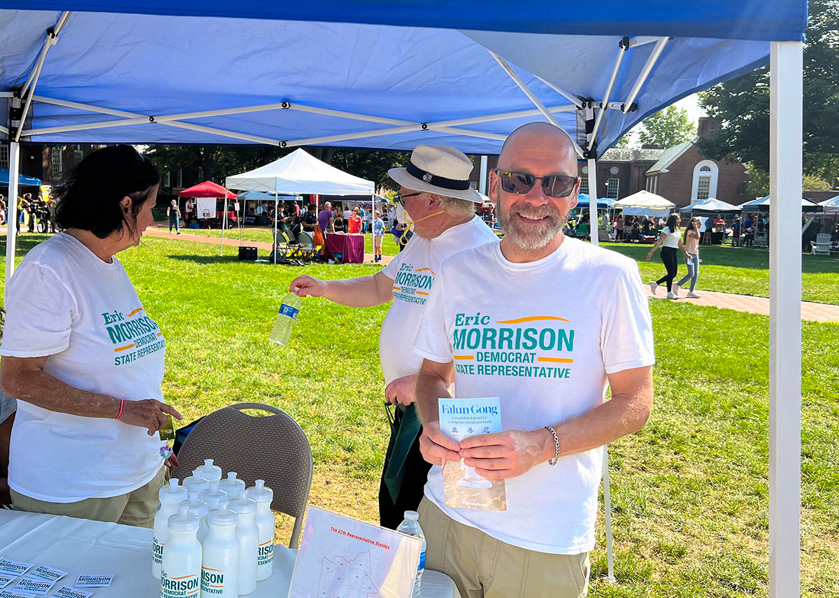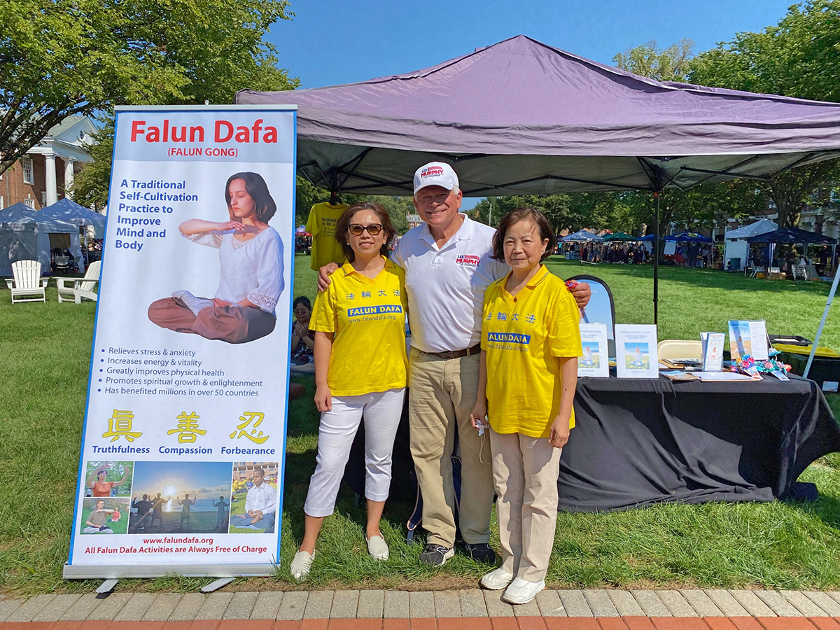 特拉华州联邦众议员候选人李·墨菲(Lee Murphy)到法轮功展位与学员交谈,称赞“真、善、忍是多么美好的词汇!”他谴责中共对法轮功学员长达二十三年的迫害“太惨无人道”。