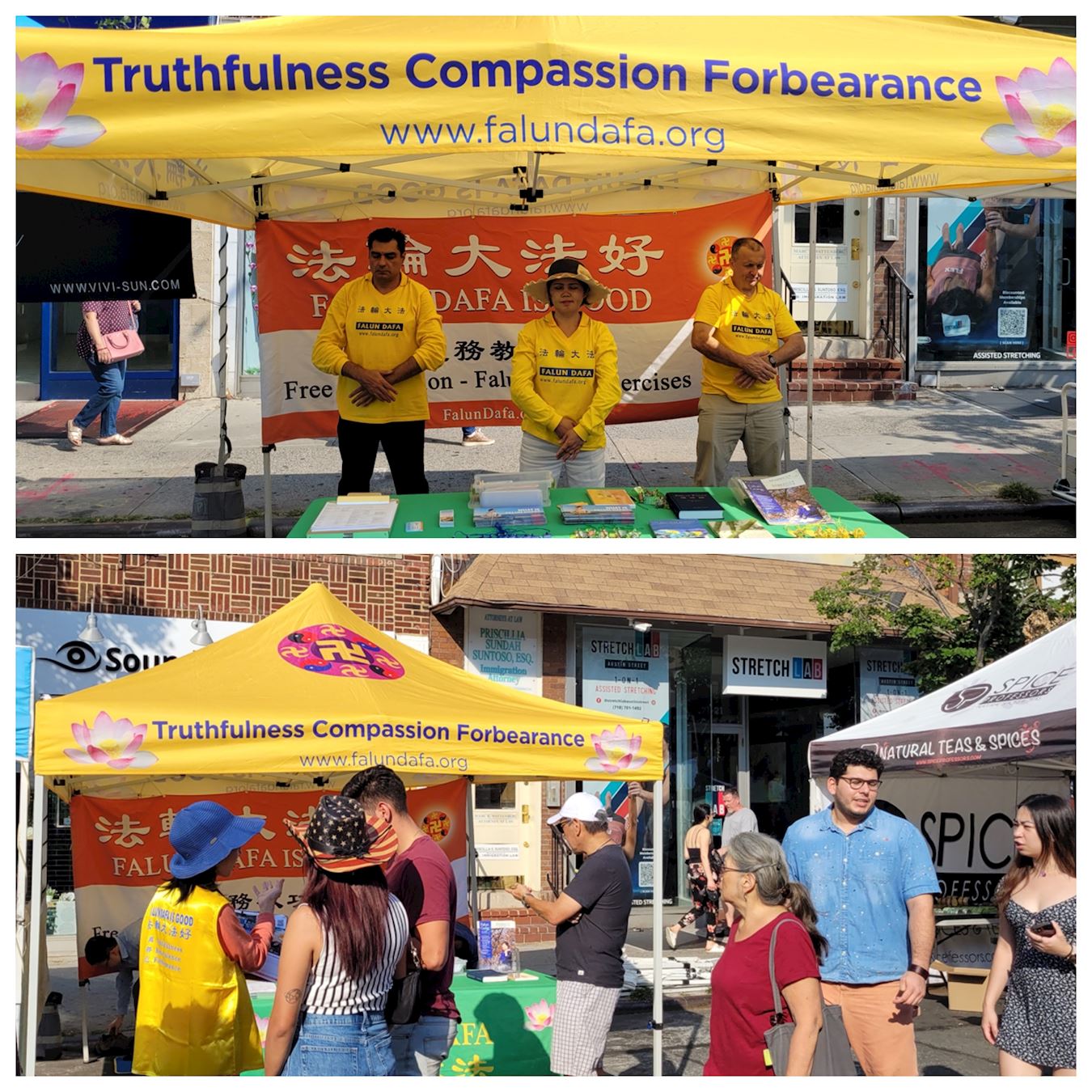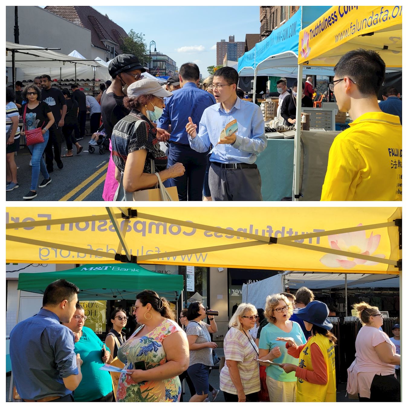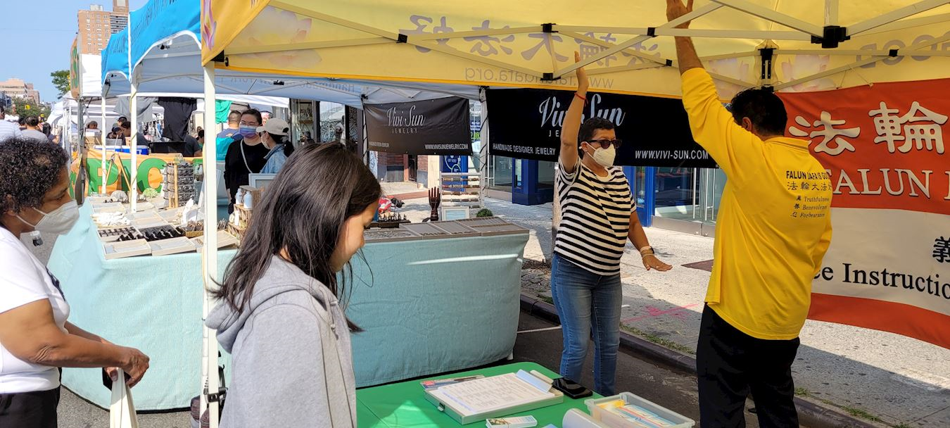 那是一个美丽的夏日周末。节日的集市设在一个中高档社区,学员们在节日集市上设置了一个帐篷,里面的桌子上摆放着各类介绍法轮功的传单和莲花。他们有的演示功法,有的向人介绍功法特点、分发传单和手工纸莲花。许多居民出来散步购物,阳光下整个街区热闹非凡。许多路人停下脚步向法轮功学员详细了解功法。一些人当即跟着学员学炼功法。他们表示非常喜欢法轮功的功法,有的还要寻找自己所在地区的炼功点。