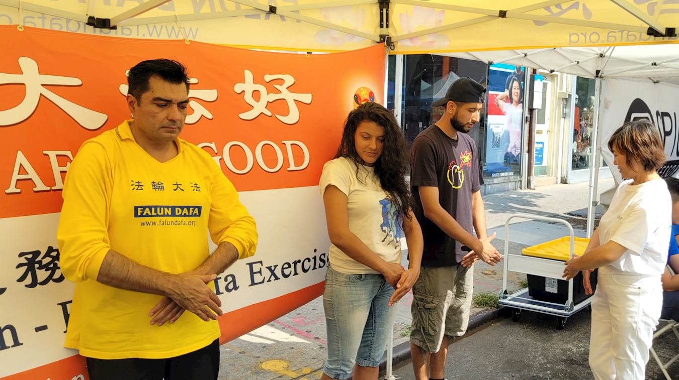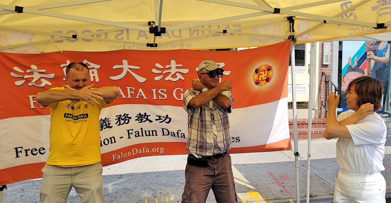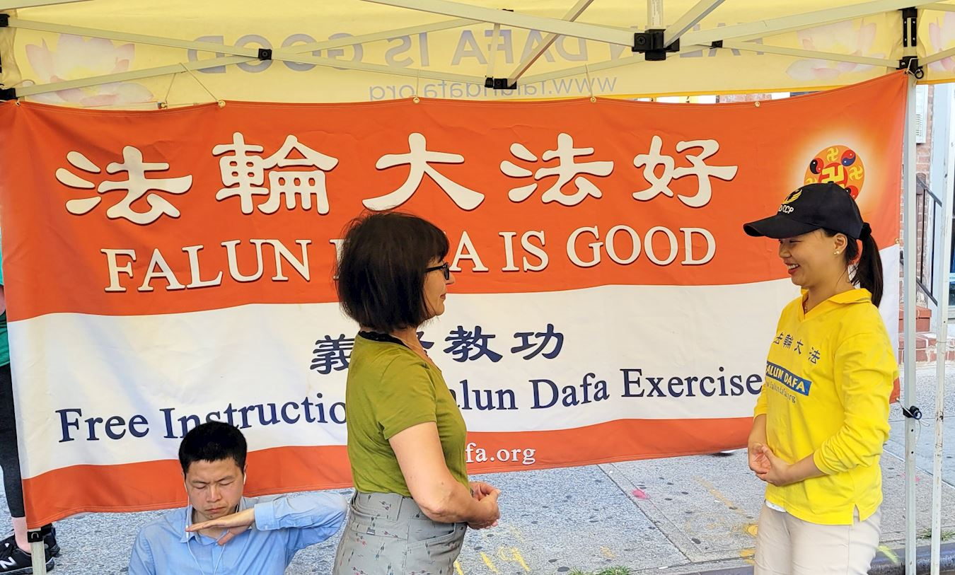 伊莲娜(Illena )女士经过法轮功的展位,看到法轮功学员在炼功,她很感兴趣,与学员交谈后,当场学了第一套功法。她告诉学员说她感觉很好。稍晚,她带了一位朋友来到展位,和学员一起向她的朋友介绍了功法。她的朋友似乎对功法很有兴趣。他们索要了几份小册子和材料以了解更多信息。