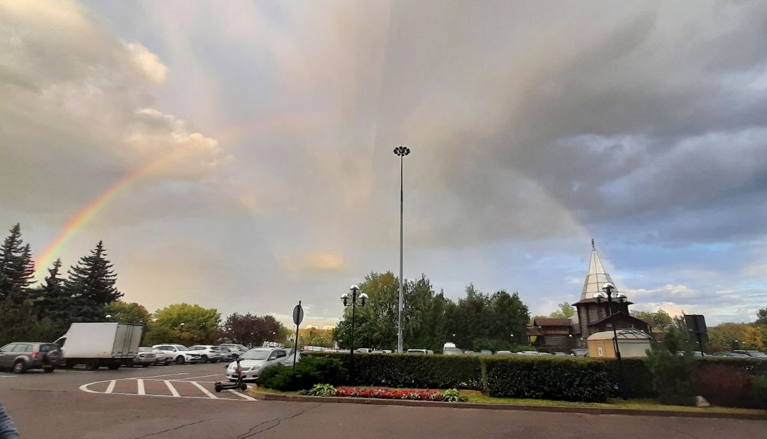 九月十七日、十八日两天清晨在公园里集体炼功,向当地民众发放资料。在法会当天,刚刚结束后,学员们走到外面时看到天空上美丽的彩虹。