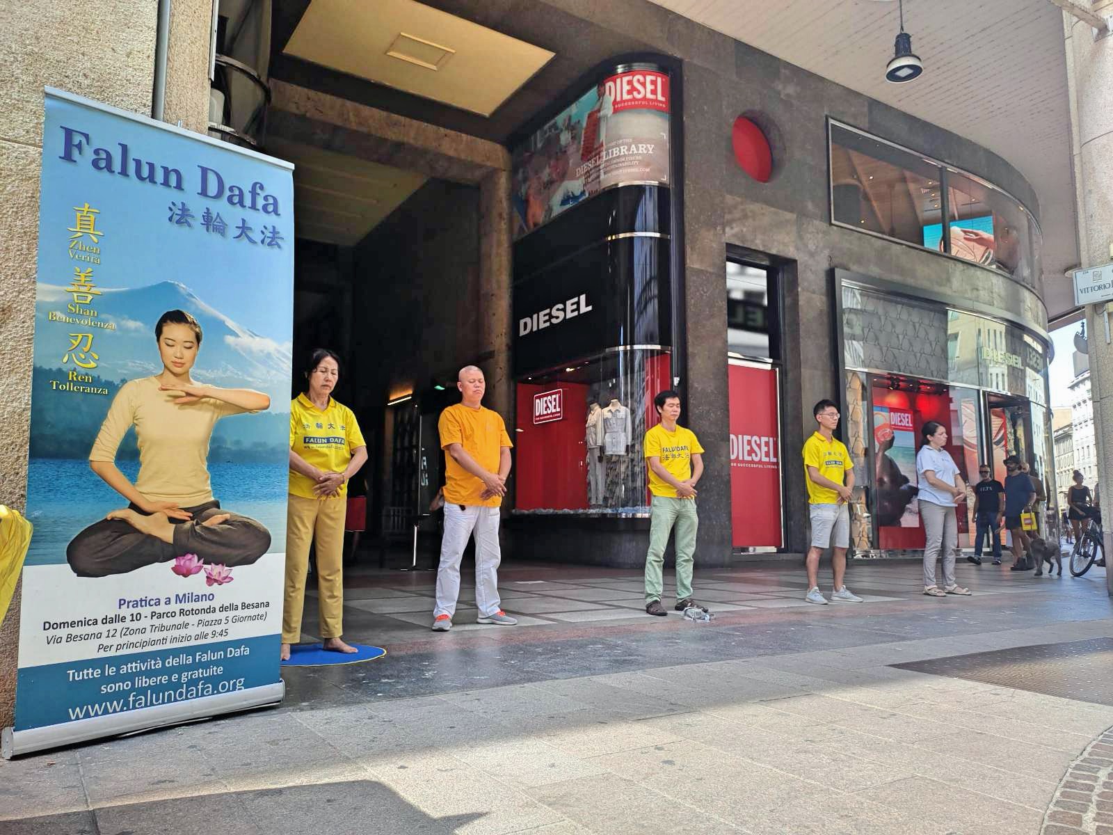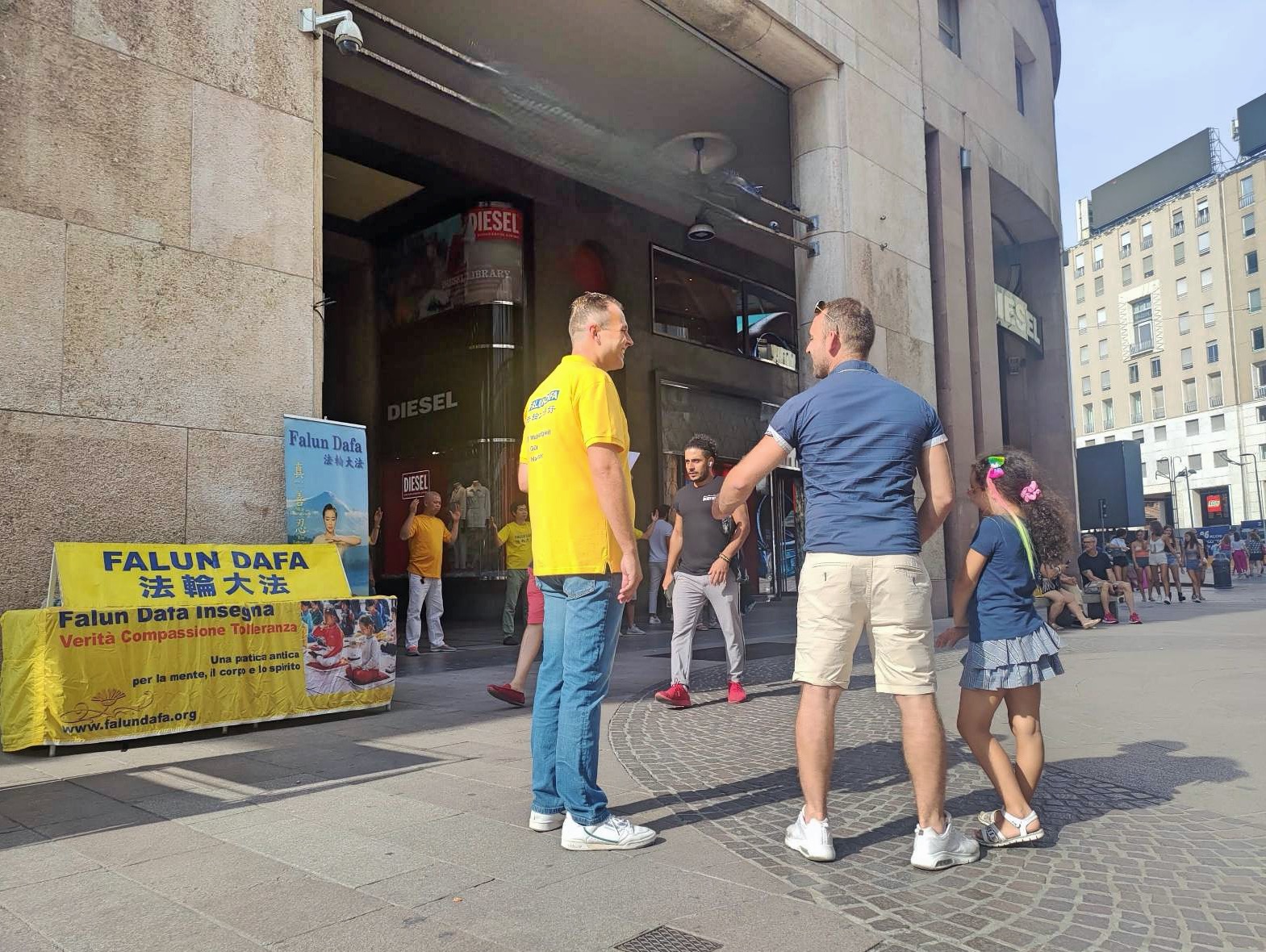 ![]() 图1~3:二零二二年八月二十七日,法轮功学员来到米兰市中心,架起真相展板,有的展示功法,有的向过往行人讲述法轮功的真相。 |