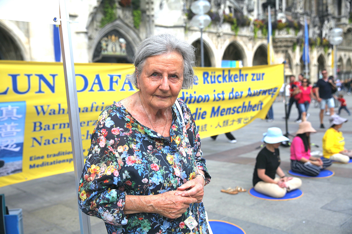 退休编辑波尔曼女士(Barbara Pohlman)于二零二二年八月二十七日路过玛利亚广场时,看到法轮功学员在展示功法,感到很平和。