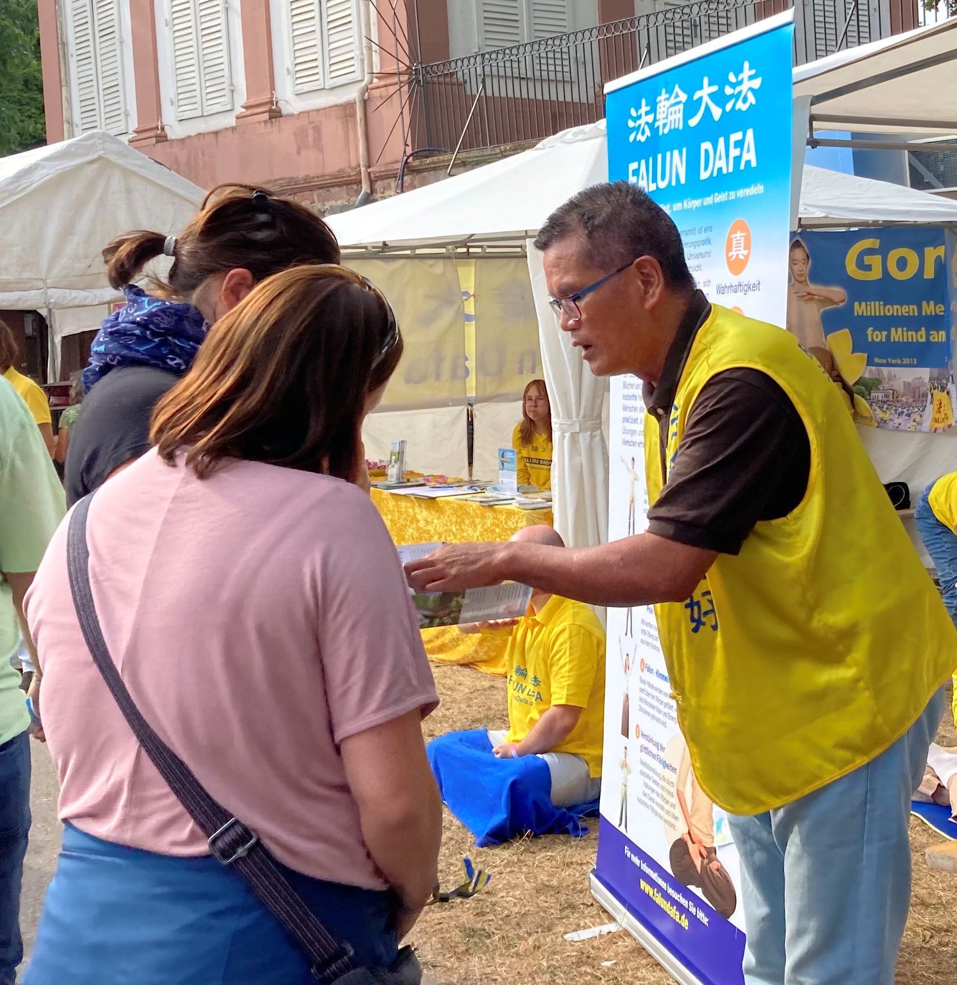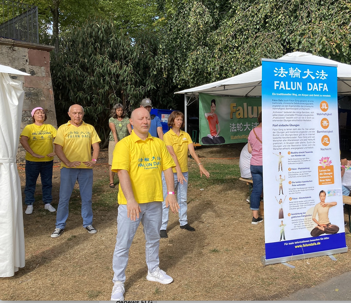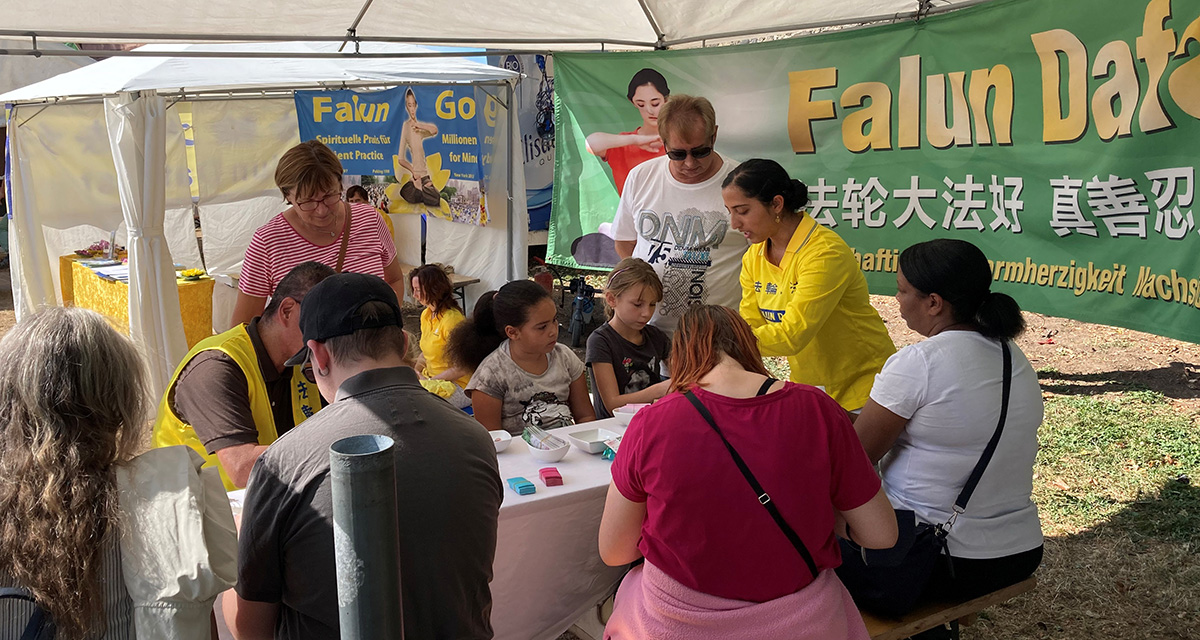哈瑙市(Hanau)是德国金融中心法兰克福的一个重要卫星城。今年第六十届民间节日按照传统在菲利普斯鲁尔宫殿(Schloss Philippsruhe)边上的美因河畔举行。据当地媒体报道,这次为时三天的节日接待了六万多游客。在熙熙攘攘的人流中,祥和的音乐和学员舒缓的炼功动作吸引了不少人的目光。当人们得知法轮功祛病健身的功效,及提高道德水准的作用后,纷纷询问在当地的炼功点和联系方式,想要学功。
