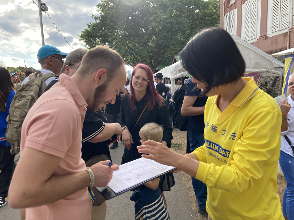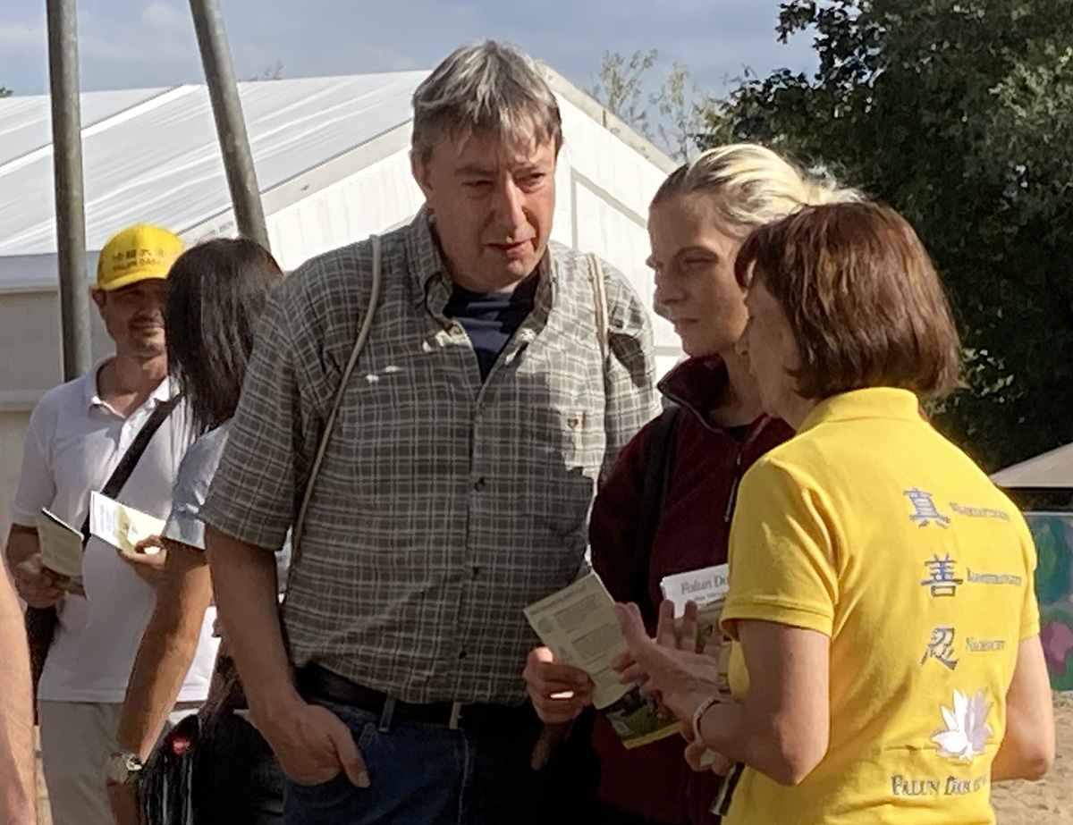 一家大型公司的人事部总管克劳斯(Klaus)在征签表上签了名,接着和法轮功学员交谈了半个多小时,他说:“我认为这些价值(真、善、忍)非常美好,愿我们的社会能有更多(真、善、忍)。我很希望我们不同的文化能互相学习。”对于迫害,他表示:“这让我从理智上无法理解,为什么由于这些原则(真、善、忍)遭受迫害。”