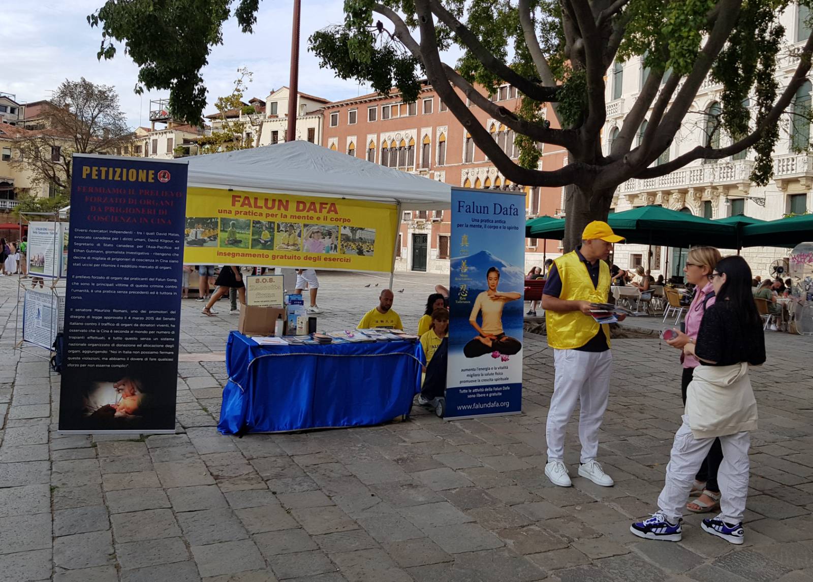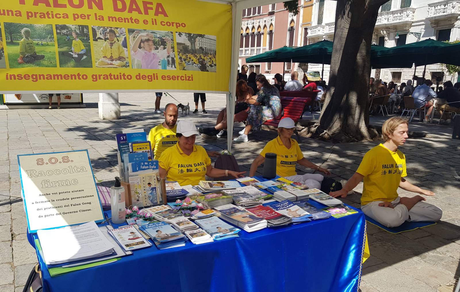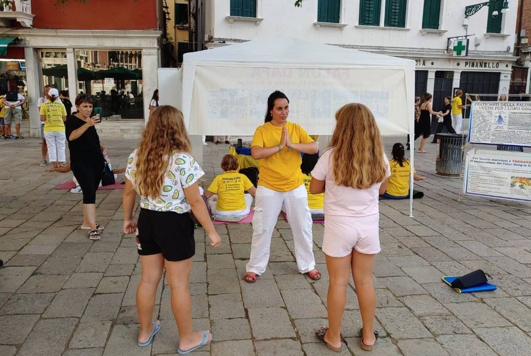 二零二二年八月二十日和九月三日,部份法轮功学员在水城威尼斯圣-马可广场举办了两天的讲清法轮功真相及征签活动。向当地民众传播大法真相及展示法轮功功法,得到行人的关注,肯定和鼓励。