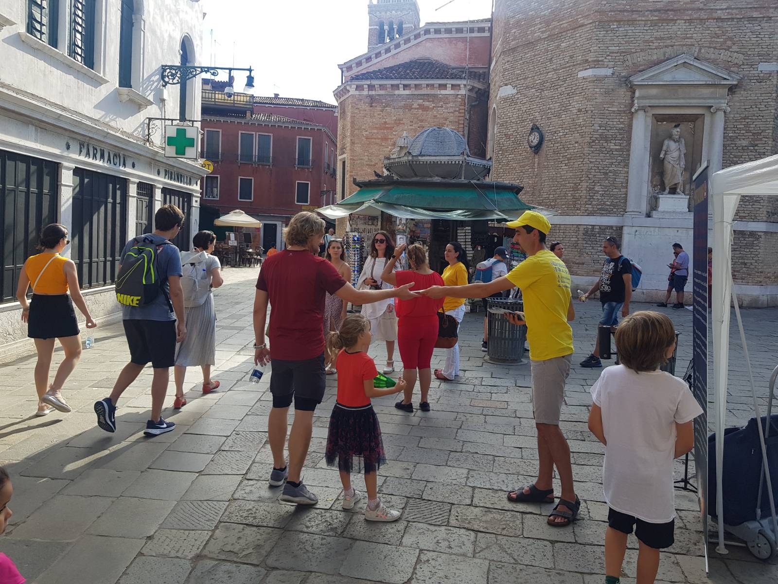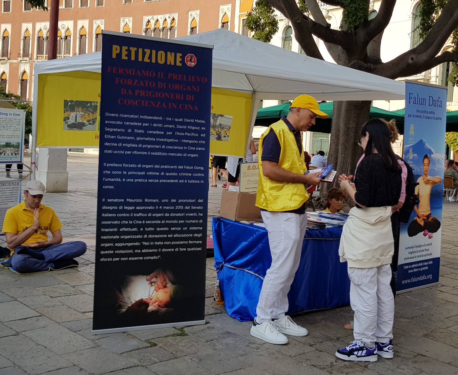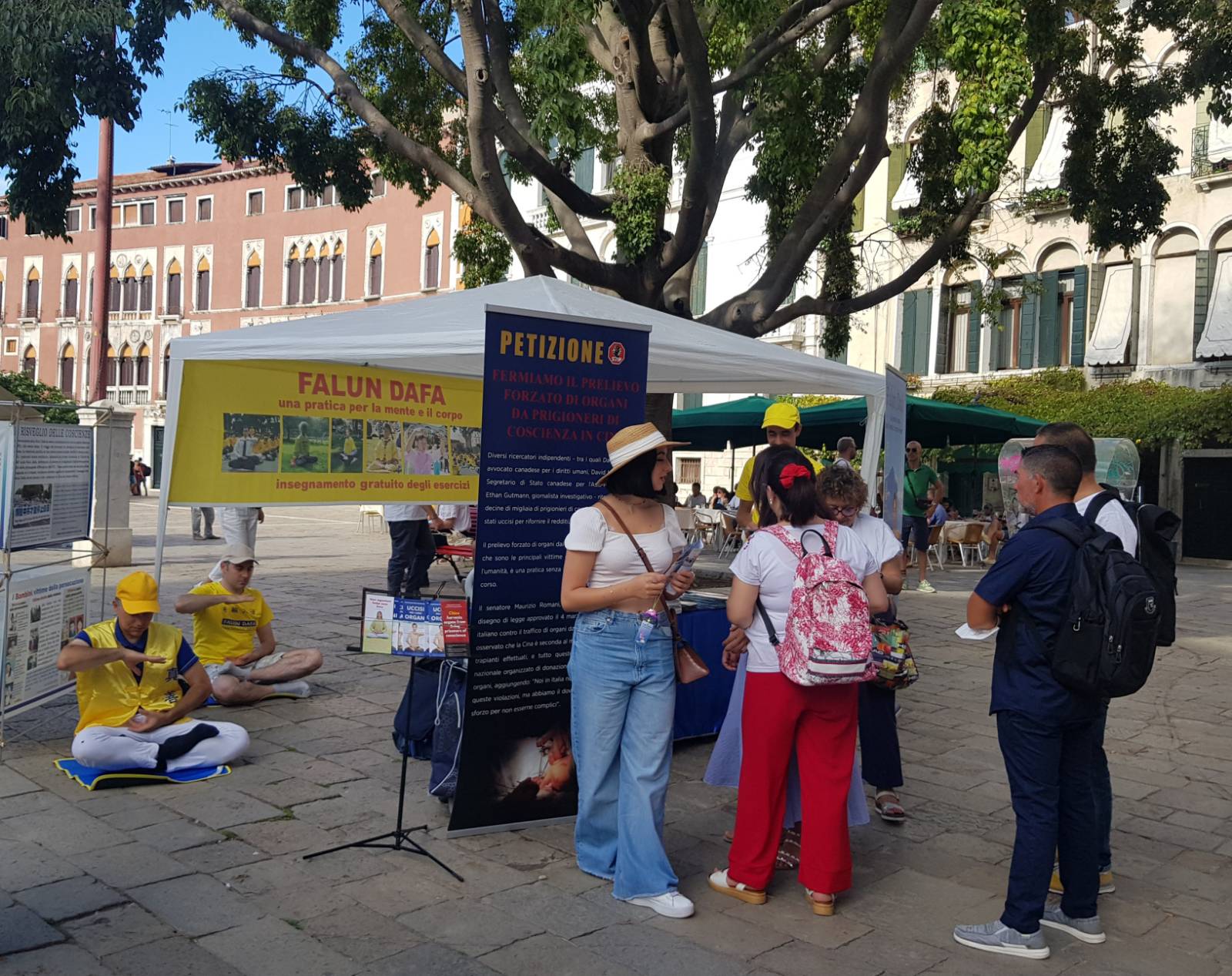 二零二二年八月二十日和九月三日,部份法轮功学员在水城威尼斯圣-马可广场举办了两天的讲清法轮功真相及征签活动。向当地民众传播大法真相及展示法轮功功法,得到行人的关注,肯定和鼓励。