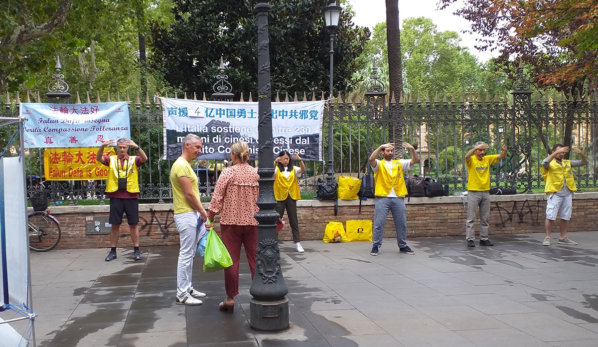 有一位意大利女士,已经练过其它气功,在观看了学员炼法轮功功法及大法横幅、展板内容后,被法轮功所吸引,并对(转法轮)著作产生了极大的兴趣,跟学员详细了解并约定要学习功法。