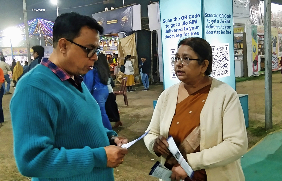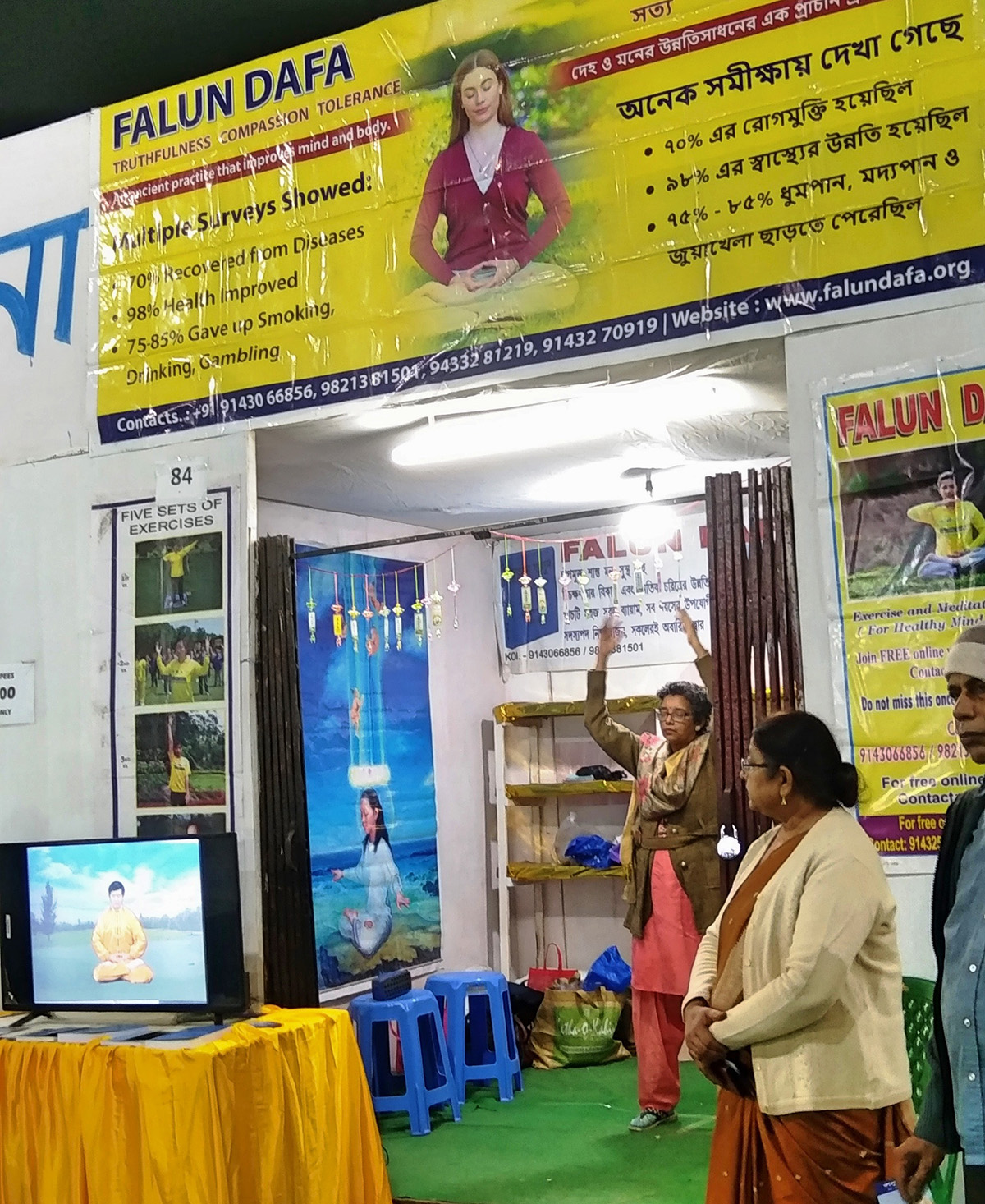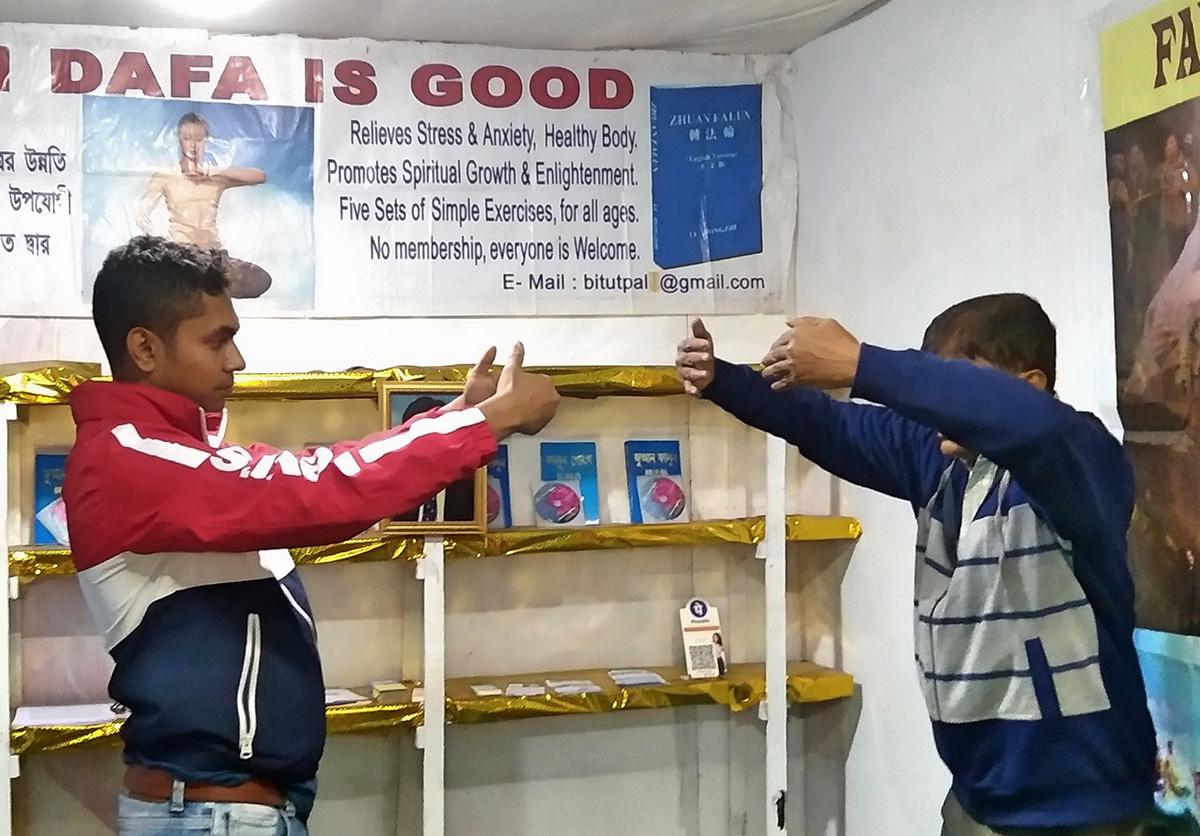 二零二二年十二月二十二日至二零二三年一月一日,印度法轮功学员受邀参加了加尔各答新市镇书展,再次向当地民众介绍法轮功。大电视屏幕上展示着缓、慢、圆的功法动作和介绍,很多人停下了脚步,好奇的看着,并希望能得到更多的相关讯息。学员们也在现场演示功法,分发关于法轮功的真相资料,并当场教人炼功。