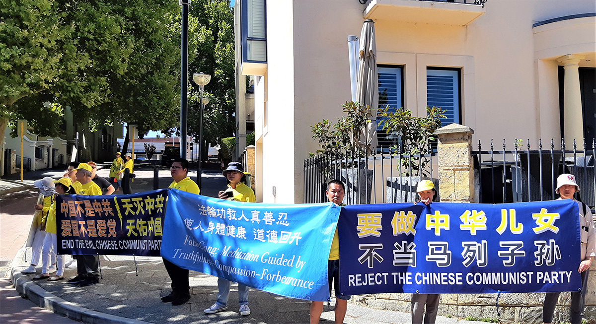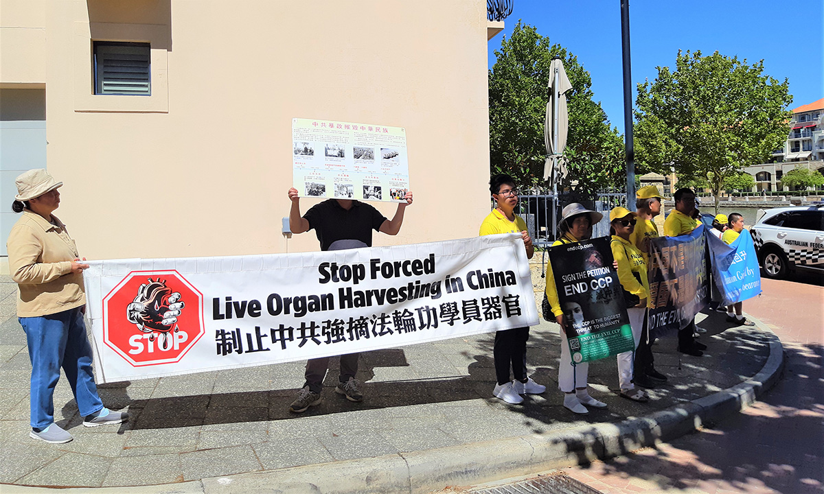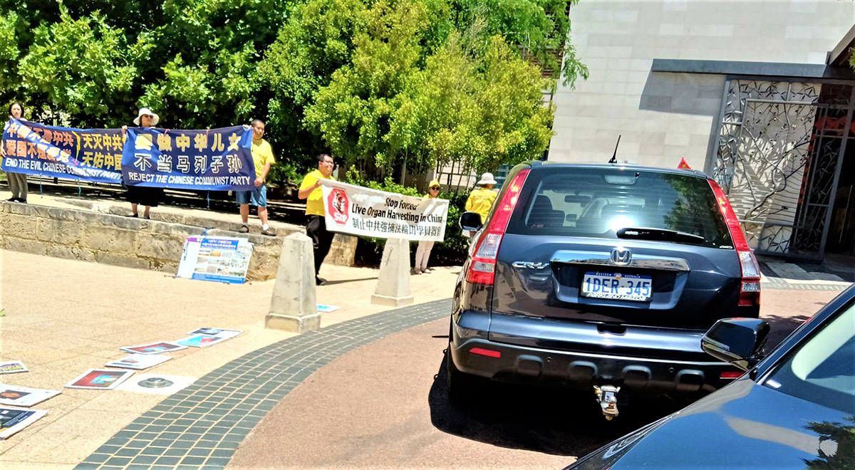 ![]() 图1~2:法轮功学员在中共驻珀斯总领事馆对面拉横幅,举展板,揭露中共罪行 |