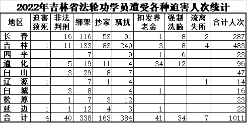 根据二零二二年明慧网曝光的吉林省法轮功学员遭迫害案例所做的不完全统计,吉林省九个地区的法轮功学员遭各种迫害1011人次。其中:被迫害致死4人;被非法判刑40人;被绑架338人次;被非法抄家163人;被骚扰384人次;被非法扣发养老金41人;被强行洗脑34人;被迫流离失所7人。