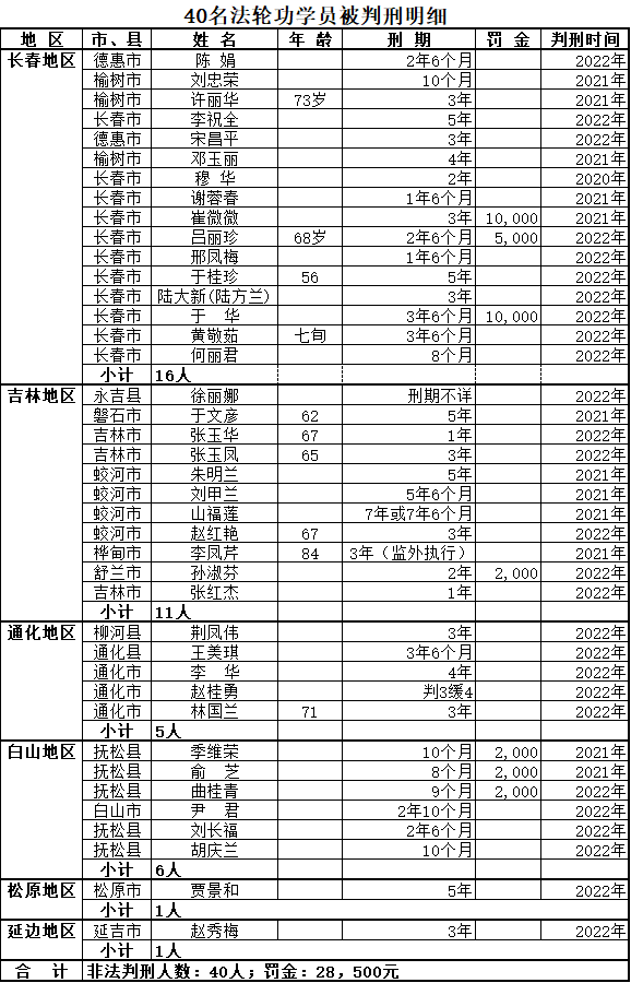 二零二二年,明慧网曝光吉林省有四十名法轮功学员被非法判刑,其中年龄最大的八十四岁。
