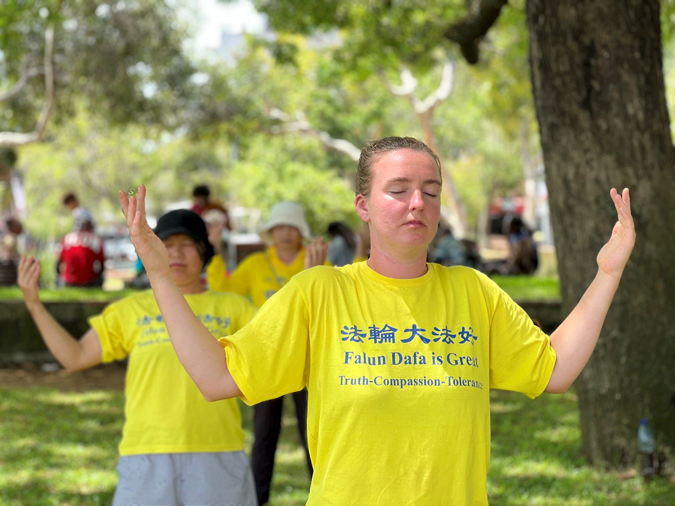 她说:“这套功法有疗愈作用、轻松,今后我还要学更多(法轮大法),让自己变得更好、更健康。真、善、忍这样的价值观,对我来说很重要,非常好,正是我需要的。我感谢有这样的机会学习法轮功,我真希望我们这里也有炼功点。”