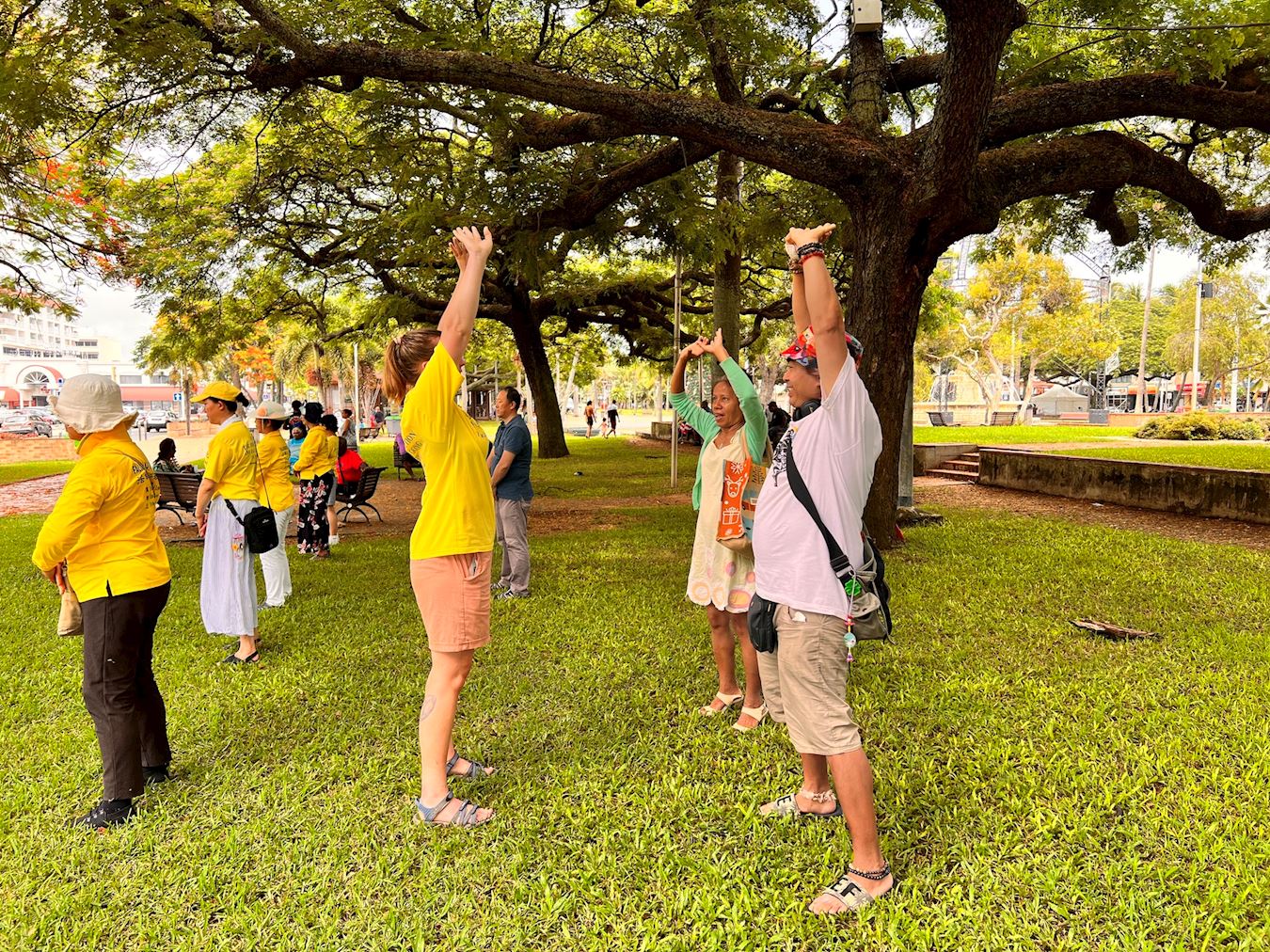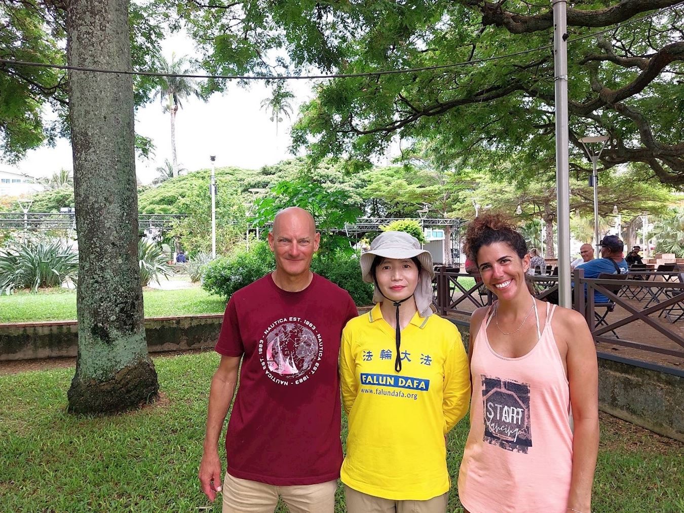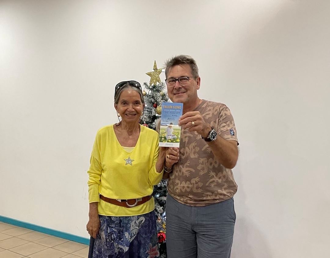 冯先生来自中国广西北海,已经在新喀里多尼亚生活了二十多年。他在公园看见法轮功学员们在炼功,黄色的T恤上的中文法轮大法好,让他眼前一亮,他立即停下单车,上前热情地打招呼、问候学员们。