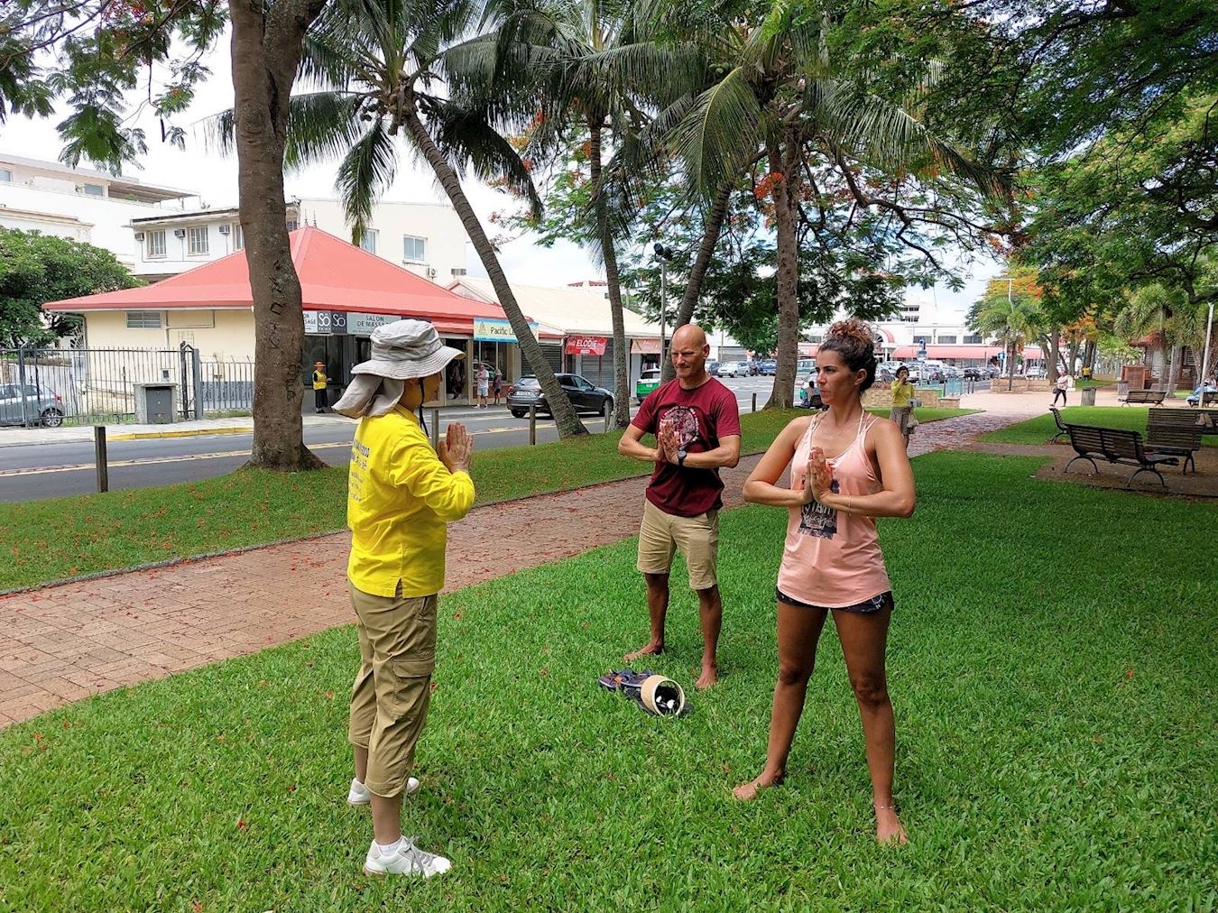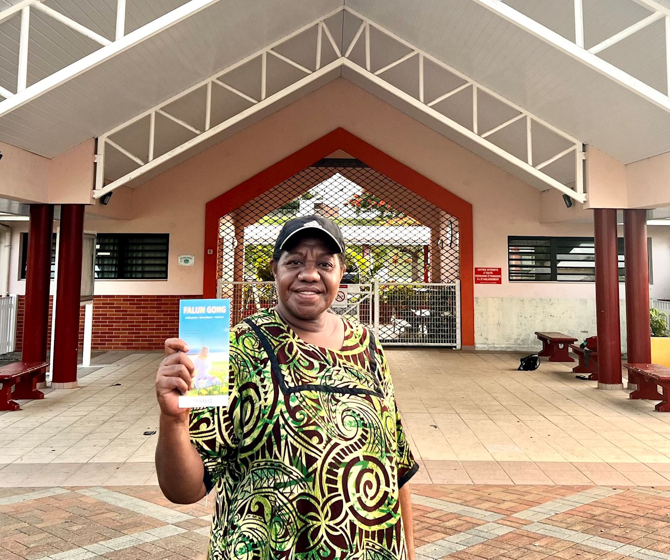 他的婶婶罗泽尔·古丁在一旁点头说:“是的,真、善、忍是我一生都在追寻的理念。我刚才学功时,感觉思想完全融入在功中,没有一点杂念,非常舒服、祥和。我们非常感谢学员们来新喀里多尼亚传播法轮功。”