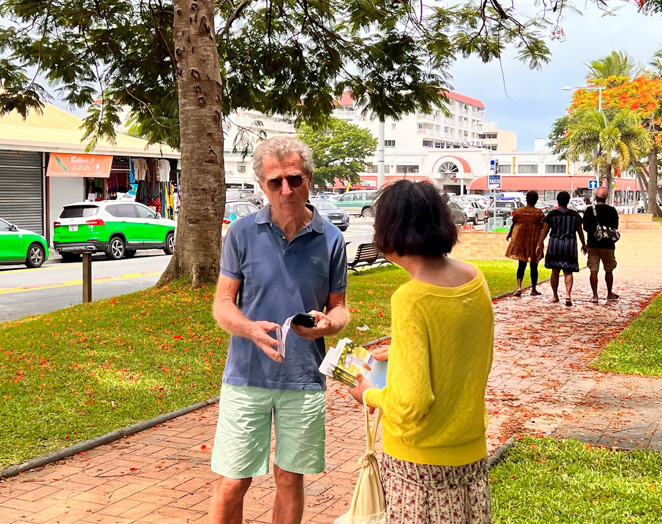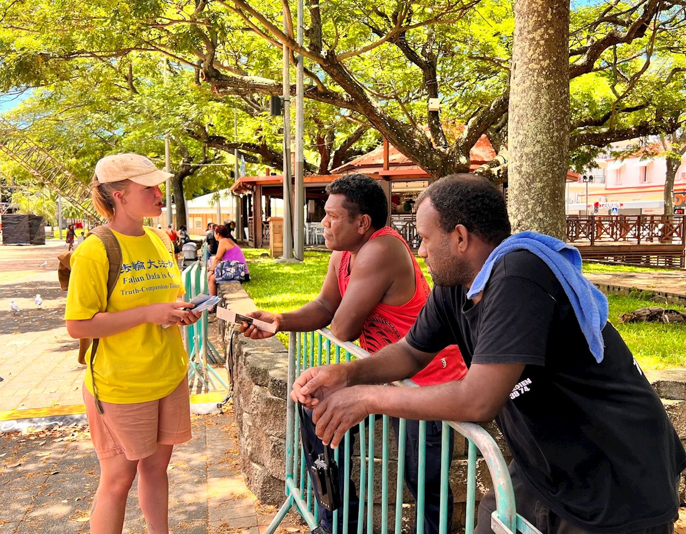 十二月的新喀里多尼亚,地表温度高达三十八度,时阴时雨,有时又阳光炙烤、天气炎热。法轮功学员们在购物中心发单张、派发信箱、在政府部门以及媒体讲真相,并且在市中心公园和一家幼儿园教功,让许多人了解了法轮功。当地一家电台向大家介绍了法轮大法,并鼓励他们去教功点学炼。新喀里多尼亚人民都非常友好、善良,他们认同真、善、忍理念,感恩有机会学习法轮大法。
